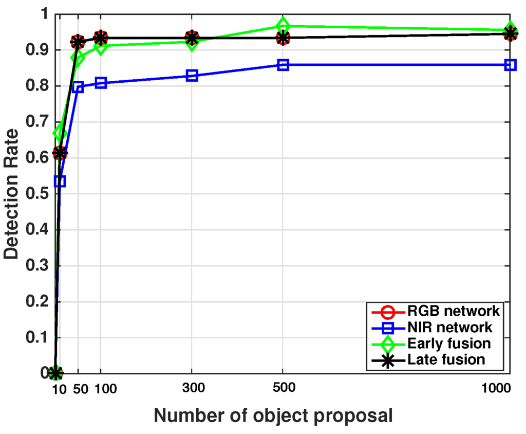 It can be observed in Figure 10 that all networks’ performances are almost saturated after generating 100 proposals. There is a subtle improvement at 500 for the NIR network and the early fusion network, but a longer computation time is required. The maximum detection rates are 0.945, 0.859, 0.967 and 0.945 for RGB, NIR, early fusion and late fusion networks, respectively. This implies that the maximum performance that we can achieve is bounded to these maximum detection rates. RGB and late fusion networks report identical performance, since the latter one simply concatenates proposals from both the RGB and NIR networks