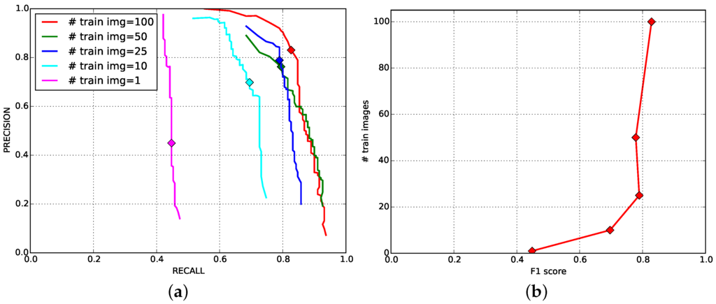 It is known that more training images leads to better performance under the framework of the deep convolutional neural network. The same trend can be seen in Figure 11. It is, however, interesting that the impact of fine-tuning shows impressive results, as only 10 training images are utilised for retraining, but produce a 0.7 F1 score. Using 50 images (green) yields a slightly lower F1 score than using 25 images (blue), but it coversa wider recall area with higher precision. In addition, this study also implies that it is feasible to achieve better performance with more fruit images.