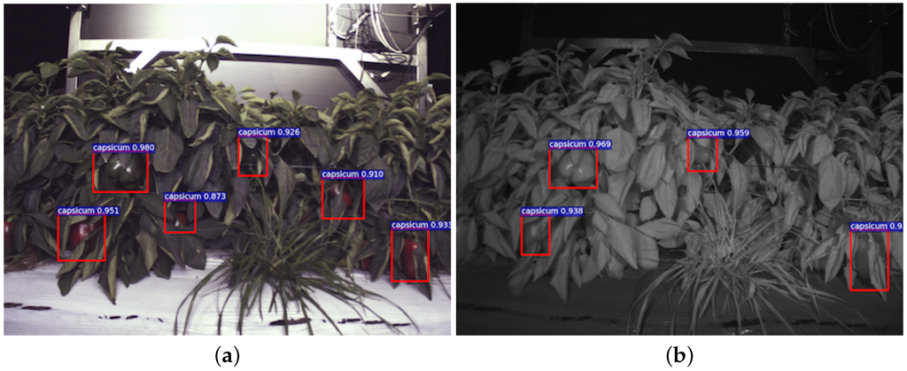 Robotic harvesting can provide a potential solution to this problem by reducing the costs of labour (longer endurance and high repeatability) and increasing fruit quality. For these reasons, there has been growing interest in the use of agricultural robots for harvesting fruit and vegetables over the past three decades [2,3]. The development of such platforms includes numerous challenging tasks, such as manipulation and picking. However, the development of an accurate fruit detection system is a crucial step toward fully-automated harvesting robots, as this is the front-end perception system before subsequent manipulation and grasping systems; if fruit is not detected or seen, it cannot be picked. This step is challenging due to various factors, among which are illumination variation, occlusions, as well as the cases when the fruit exhibits a similar visual appearance to the background, as shown in Figure 1. To overcome these, a well-generalised model that is invariant and robust to brightness and viewpoint changes and highly discriminative feature representations are required.