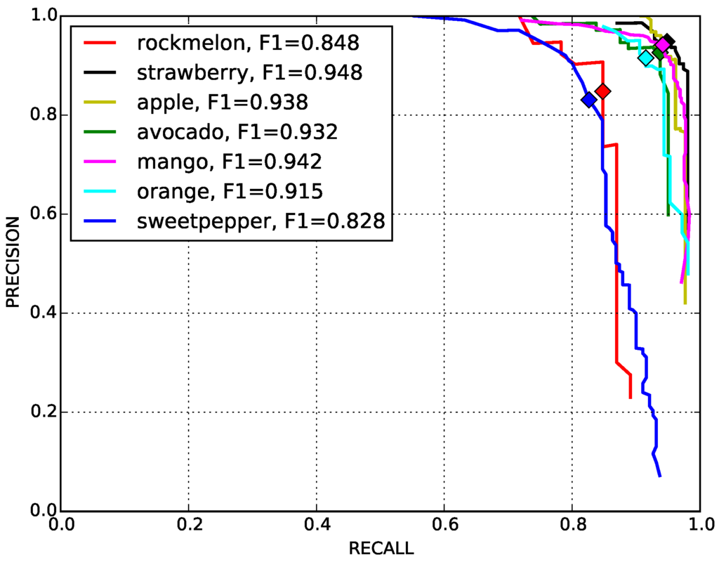 Quantitative performance evaluation for different fruits. The marks indicate the point where F1 scores are computed.