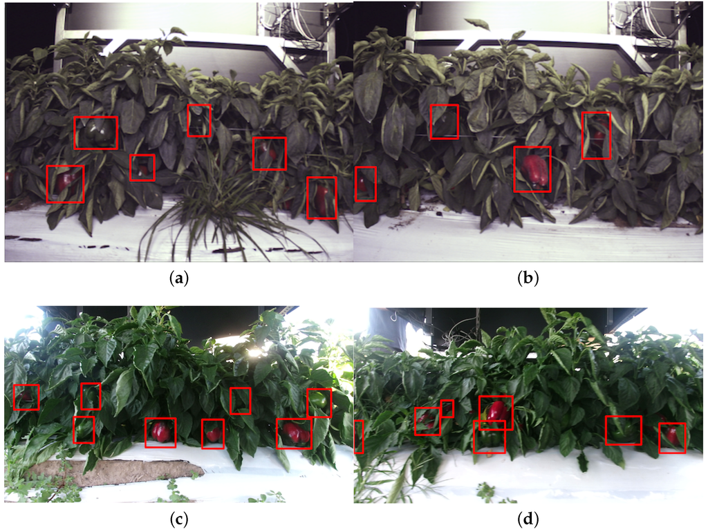 Four instances of sweet pepper detection. (a) and (b) are obtained from a farm site using a JAI camera, and (c) and (d) are collected using a Kinect 2 camera at a different farm site. Above each detection is the classification confidence output from the DCNN.