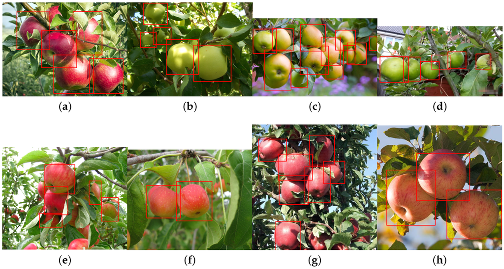 Eight instances of red (a,e–h) and green (b–d) apples detection (different varieties). Images are obtained from Google Images. Above each detection is the classification confidence output from the DCNN.