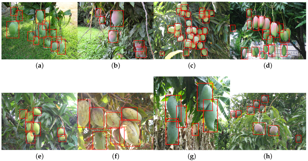 In this section, we discuss the fruit detection results presented in the previous section. It is noticeable that there are several , false negatives (miss), in Figure 18. The cause can be from two possibilities: the small set of training images; and the scales of fruits in the testing images can be considerably different. We perform a supervised machine learning task that trains a model of the object of interest. A deep neural network can reasonably handle some variations in scales due to its deep convolutional layers. More specifically, the VGG net consist of 13 convolutional operations (3 × 3 kernels), five max pooling layers (2 × 2 kernels) and three fully-connected operations. However, if an object size in a testing image is significantly less than that of a training set, it misses the detection. Empirically, we have witnessed that the proposed detector can handle around 50% scaled-down object detection.