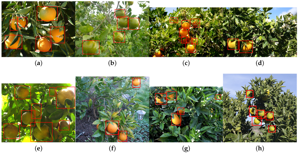 Eight instances (a–g), and (h) of orange detection (varying levels of ripeness). Images are obtained from Google Images.