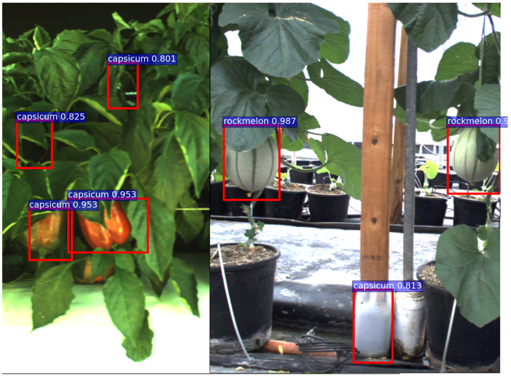Figure 14 shows quantitative results for seven fruits as precision-recall and F1 scores. We achieve promising results for all fruits. Although the number of the testing dataset is small due to limited accessible labour for data annotation, F1 scores are all above 0.8. It can be observed that the detection results of sweet pepper and rock melon are slightly inferior compared to other fruits. This is mainly due to the large occlusions of fruits at farm sites, as shown in Figure 15 and Figure 16. For qualitative inspection, we present eight instances of fruit detection, except sweet pepper and rock melon (low visuality due to small fruits) throughout Figure 17, Figure 18, Figure 19, Figure 20 and Figure 21.