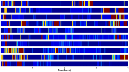 Subject specific activity barcodes. The scale on the right indicates the activity intensity, starting from 1: sitting, 2: standing, 3–14: walking with different cadences and locomotion period durations. Lempel-Ziv complexity values for each subject and for each activity monitoring system are shown.