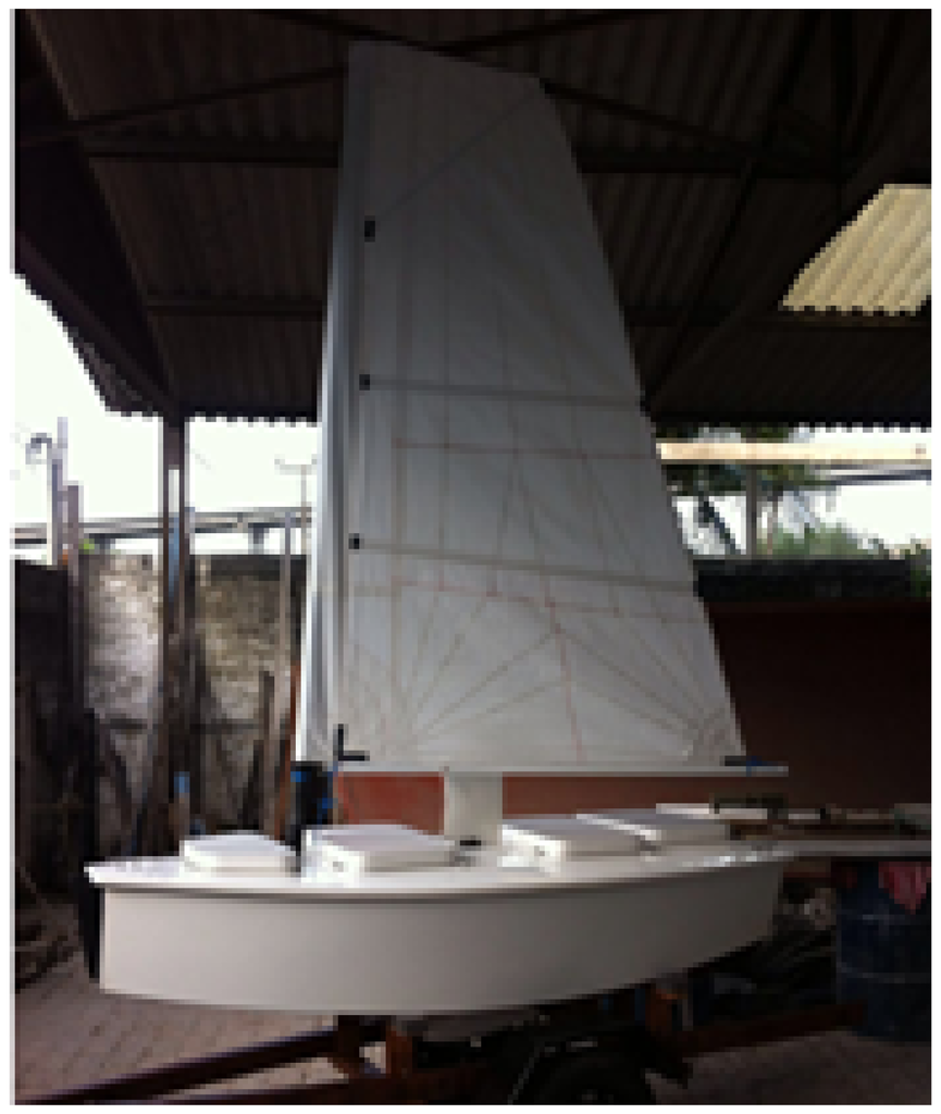 The N-Boat—The Sailboat Robot project [4] is developed by the Laboratory for Perceptual Robotics of Natalnet Associate Labs of UFRN. This sailboat is projected for monitoring of lakes and rivers besides the intention of eventually be competing in the Microtransat challenge. It has a robust control system tested in previous works [4,19] and is planned to have energy sufficiency based on the use of solar panels for charging the two 105 A nautical batteries. It is developed for autonomous navigation thus being ideal for long endurance monitoring. The first version of N-Boat is actually fully working after integration of the several works developed. Currently a new version of N-Boat with 2.4 m long (twice the size of the first version) is finalized. The sensors architecture proposed in the current work will operate installed in this new version of N-Boat. Figure 2 shows the N-Boat II already finalized, the hardware and mechanical parts of the sensors platform will be placed at at its bow (in the frontal part of it). The hardware (circuits, embedded computer) and mechanical parts necessary for operating the sensors (motors, gears, spool) will be inside the first waterproof compartment seen in the bow, with only the sensors left outside the boat, at one of its side.