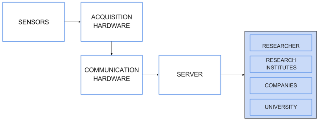 In order for the mechatronic system proposed here to work correctly, we have designed and implemented a hardware architecture taking into account specific needs of the system. As well, a well devised software architecture is necessary to make the system components interacting to each other in a desirable way, in order for the whole system to work as expected. The general operating flow devised for the monitoring system is ilustrated in Figure 3. Basically, the system acquires data from sensors by way of an acquisition hardware commanded by the Central Computer. This computer receives data through some low-level communication protocol, process them and sends them through another communication protocol to a web server (which is remotely located). This server makes data available to final users by way of using a dynamic web page, which allows the updating of them in real time. These data can be accessed on the Internet (with a prototype page working at by any (further registered, if necessary) users. Both hardware and system architectures are detailed in the following.