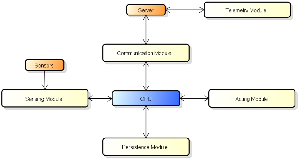 The hardware architecture is divided in 5 modules: Sensor, Communication, Persistency, Actuator, and Telemetry. Besides these, the system has a Central Computer, which is a single board computer (SBC) for the processing control, and a (remote) Web Server that is responsible for making data available to users. Figure 4 shows the details of the proposed high-level hardware architecture.