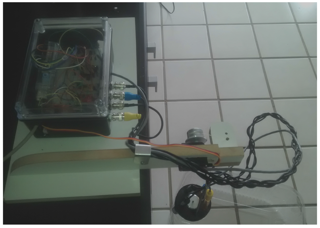 Physical system prototype, in the botton it can be seen a piece of wood with a spool (attached to a servomotor) where it runs the thread that put the sensors in and out of the water; the electronic circuit prototyped in a board can be seen in the top left box (will be seen in detail in Figure 6); the sensors are (waterproof) coupled at the end of the braided cables seen in the right botton.
