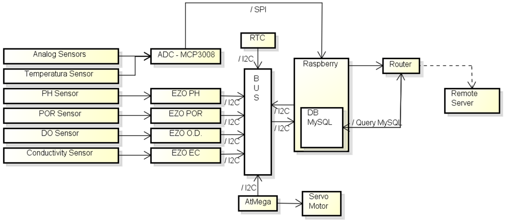 Figure 7 shows the flow diagram of the system as well the corresponding protocols (or languages) for the components communication. We remark that the electronic circuit board that implements the water monitoring cycle is currently working as a prototype board (to be printed). It can be seen in Figure 6, as well the roles and/or components of each subsystem.