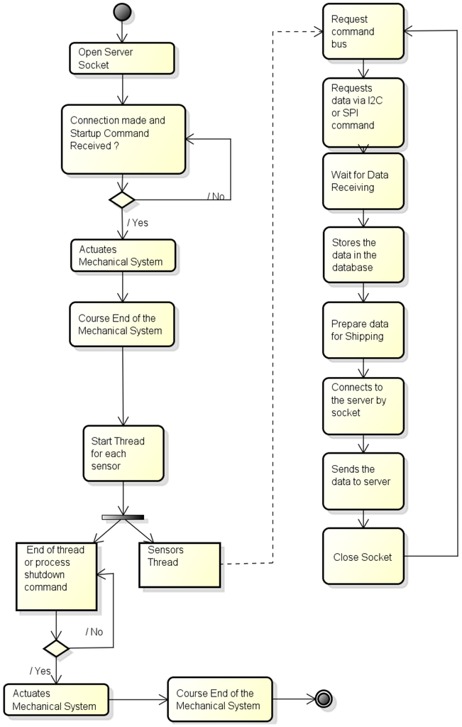 Figure 8 illustrates the flow diagram for the program running in the RPi system. This process should be able to receive, to process, and to send data from the sensors without interference in the system real-time processing. Thus, we have designed an architecture that makes it possible to the system to work adapting it to some sensors characteristics, as for example the need of a one second waiting time for each answer of the EZO board. Besides, this process should also be able to activate the mechanical system (Actuator module) inserting (and removing) the sensors into (and from) the water.