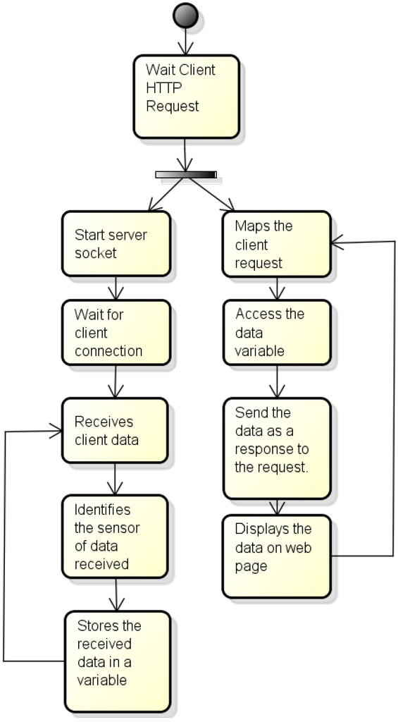 The process running on the server side needs to receive data sent from the process embedded in the RPi system, to identify from which sensors these data are coming from, and to store them in local variables in order for them to be further sent to the web server. At the same time, this process should run the connections from the client, sending required data and presenting them in the screen. A working flow diagram for this process is shown in Figure 9.