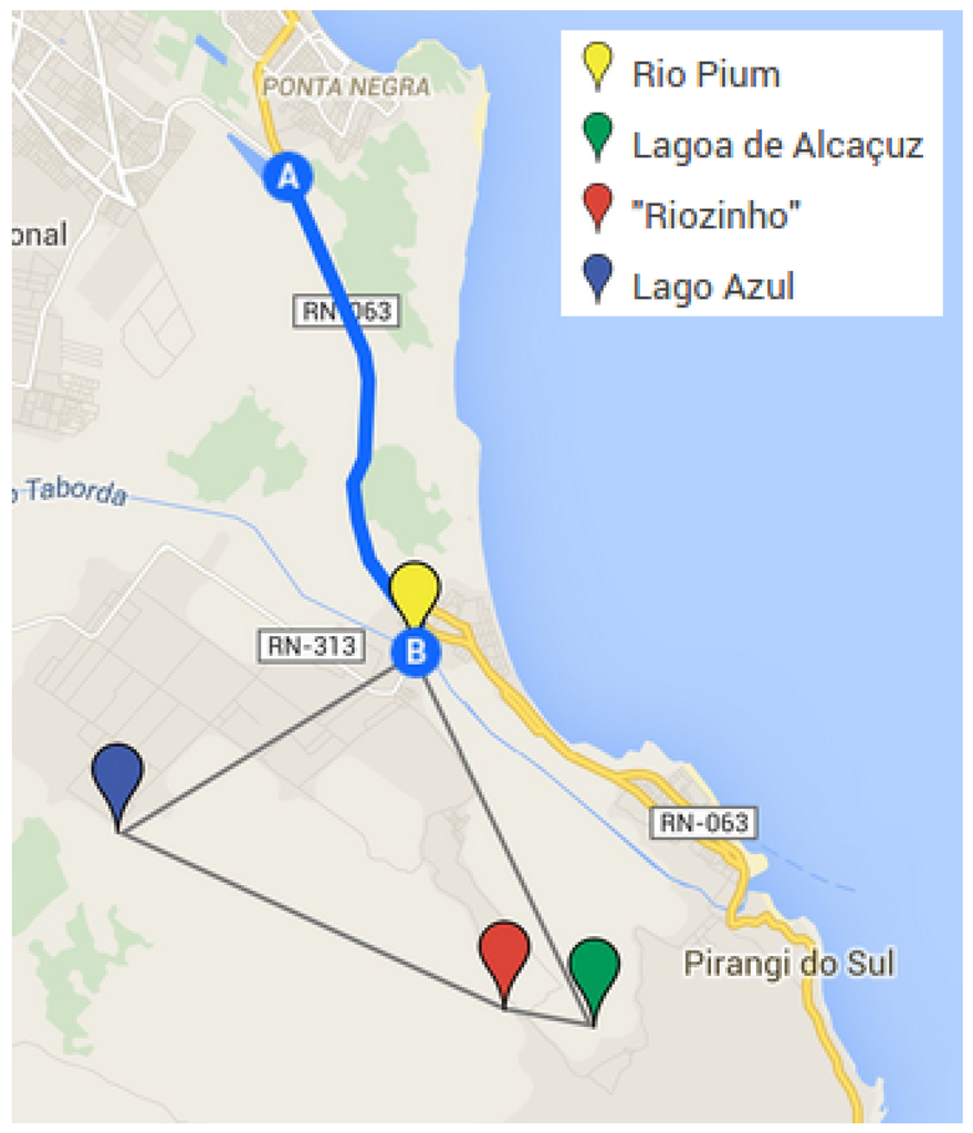 Figure 10 shows the places where data are collected. Point A in the map indicates Natal, state capital of Rio Grande do Norte. All the samples were collected in the same day, the N-Boat sailboat was not ready so we brought the system at hand using a vehicle for that and the actuator is put onto a wood platform to acquire data.