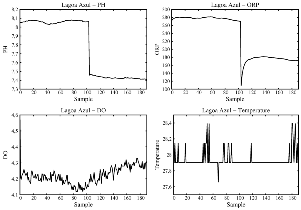 We remark that two of the samples were acquired at the Small River, one in its actual source, and the other one a little down, some 500 m away. This second place suffers anthropic interferences caused by people that comes using Buggies, Jeeps and Trollers, that are cars adapted to all terrain, thus supposably modifying the physical-chemical parameters of the water. Figure 11 shows the graphics obtained for the Blue Lake. It is important to note some situations that can be deduced from the analysis of these graphics. For example, the pH as well as the ORP show a subtle variation close to the sample 100. That happens because the sensors were inserted into the water justly after the system becomes up. The oxygen and temperature graphics do not vary considerably.