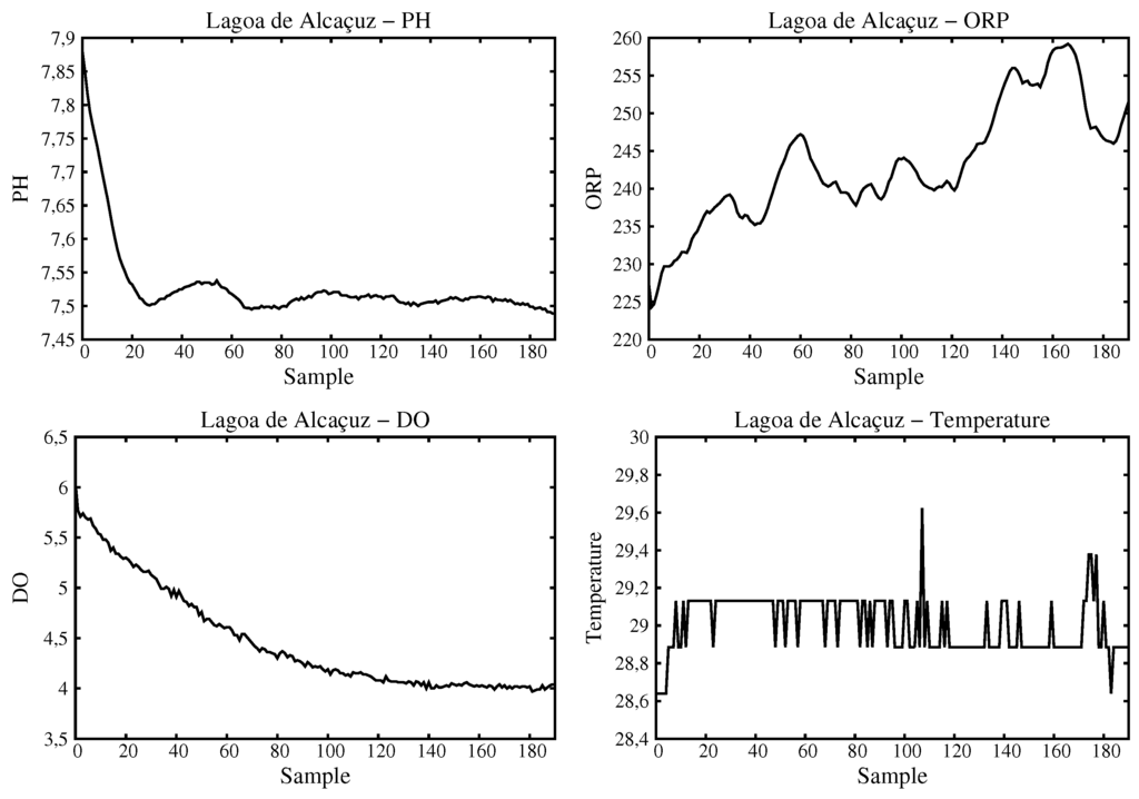 Figure 12 shows the values obtained for Alcaçuz Lake. As seen, as the sensor was used accordingly, there are no subtle variations if compared to the Blue Lake. The biggest variation has occurred with ORP index that could not stabilize completely going to levels as close to 250 mV.