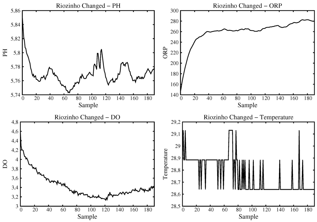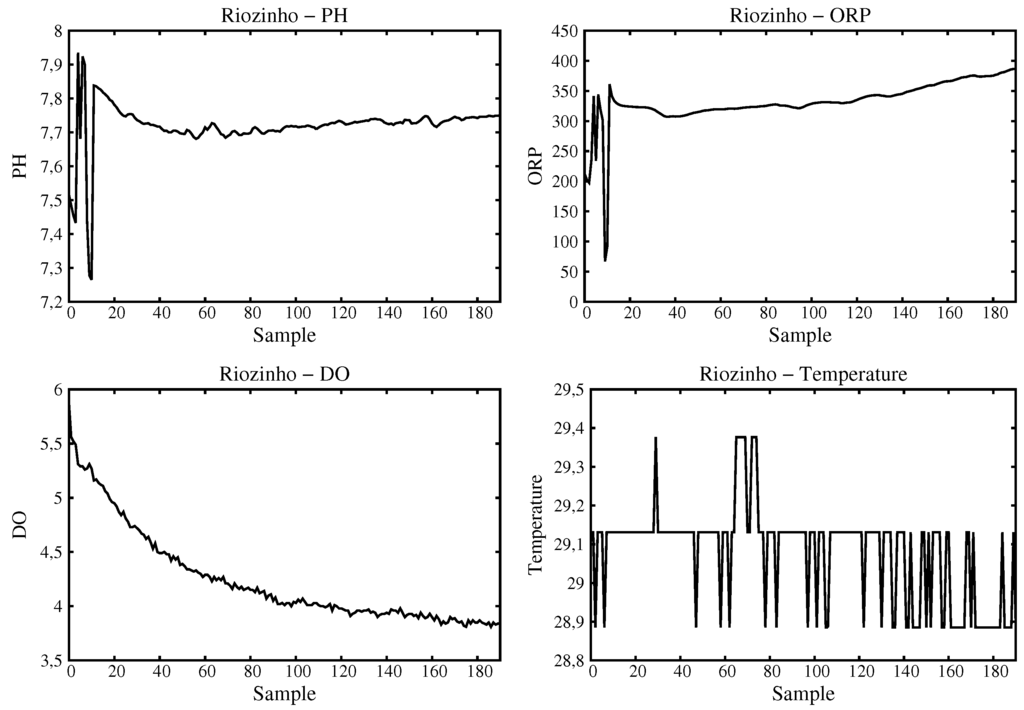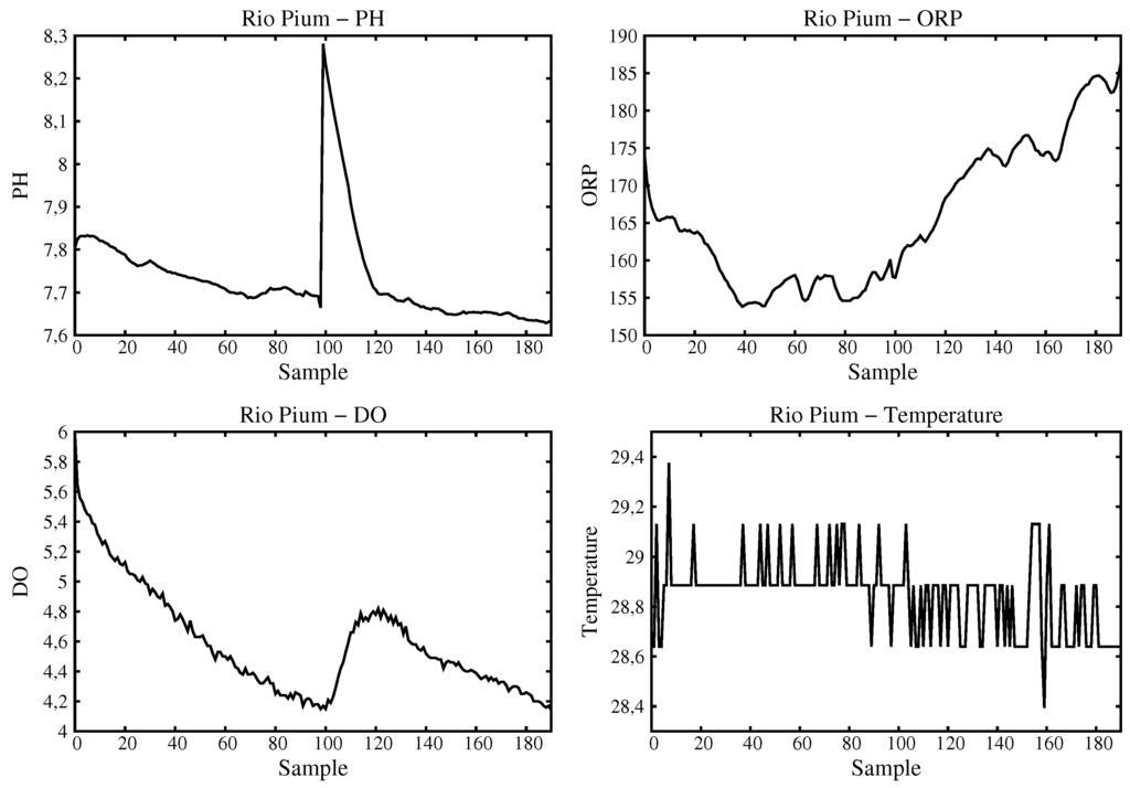 The graphics for data obtained at Pium River are shown in Figure 13. An interesting analysis is the small variation observed for the dissolved oxygen that occurred in between samples 100 and 160. This shows that a unique sampling analysis (as is the case with manual sampling for example) could mislead to wrong values. In this case, as the sensor is in the water for some time, the actual value can be obtained.