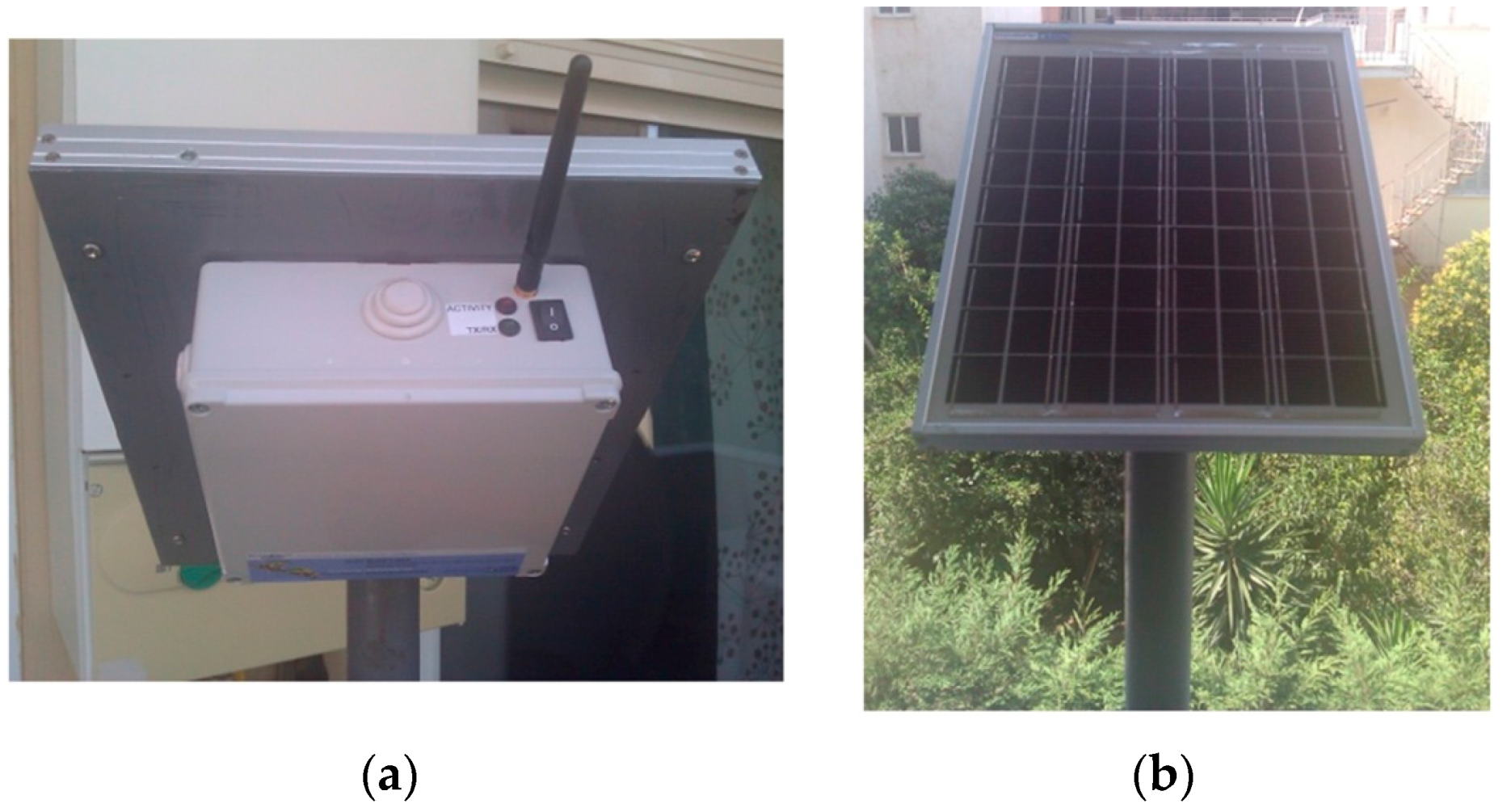 Figure 29a displays a SensoTube-based WSAN node in an orchard. As it is shown, the plastic tube has been used not only for the encapsulation of the electronic systems but also as a support pole. The solar panel of the node has been easily adapted to the top cap of the plastic tube, as it is shown in
