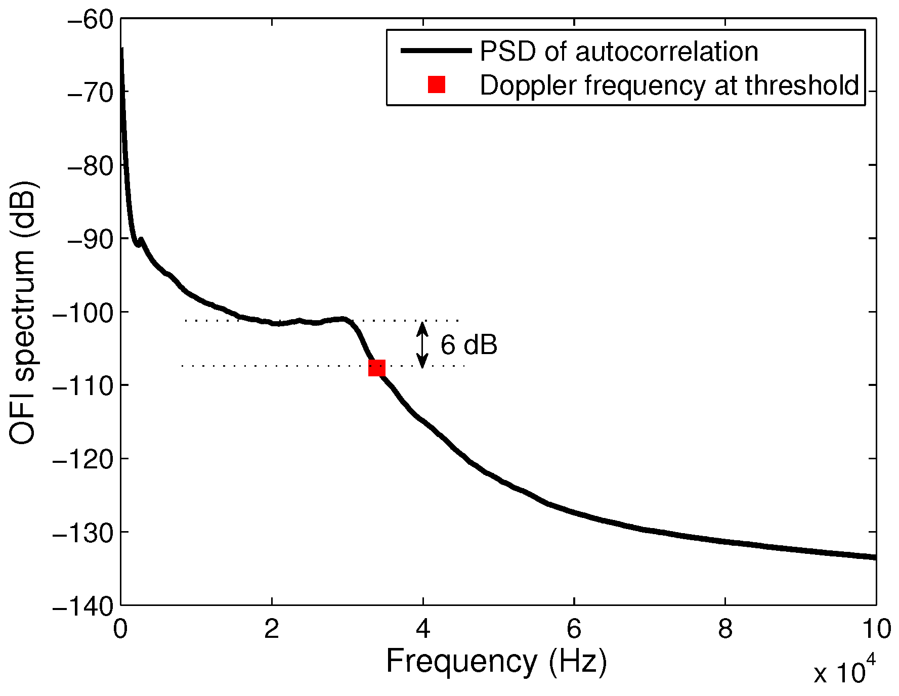 Since the signal is related to the velocity vector of each particle in the flow, its frequency domain representation shows distribution of power in the low frequency range (Figure 2). The low concentrations of particles in the fluids induces a typical signal’s spectrum with a frequency distribution corresponding to the single scattering regime with a plateau that ends at the maximum Doppler frequency. In the case of single scattering, it is then usually accepted to calculate the maximum velocity from a cutoff frequency determined at a threshold of −3 dB below the plateau of the power spectrum [11]. Because our signal’s spectrum is calculated from the autocorrelation of the signal, then the maximum velocity is found at a cutoff frequency that corresponds to a thresold of −6 dB as depicted in Figure 2, which corresponds to the square of the standard threshold.