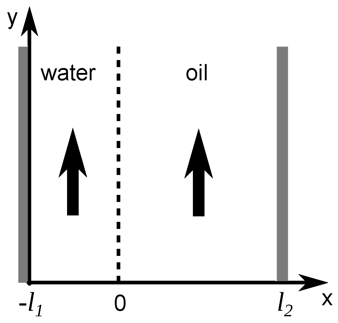 Let us consider the scheme of the fluid flows represented in Figure 3, with liquid 1 as water and liquid 2 as oil. The microchannel of width contains both immiscible fluids and the interface between them is located at a transverse position along the channel width. Considering a constant pressure gradient, solving Equation (2) for each phase leads to the following formulation for water and oil, respectively: