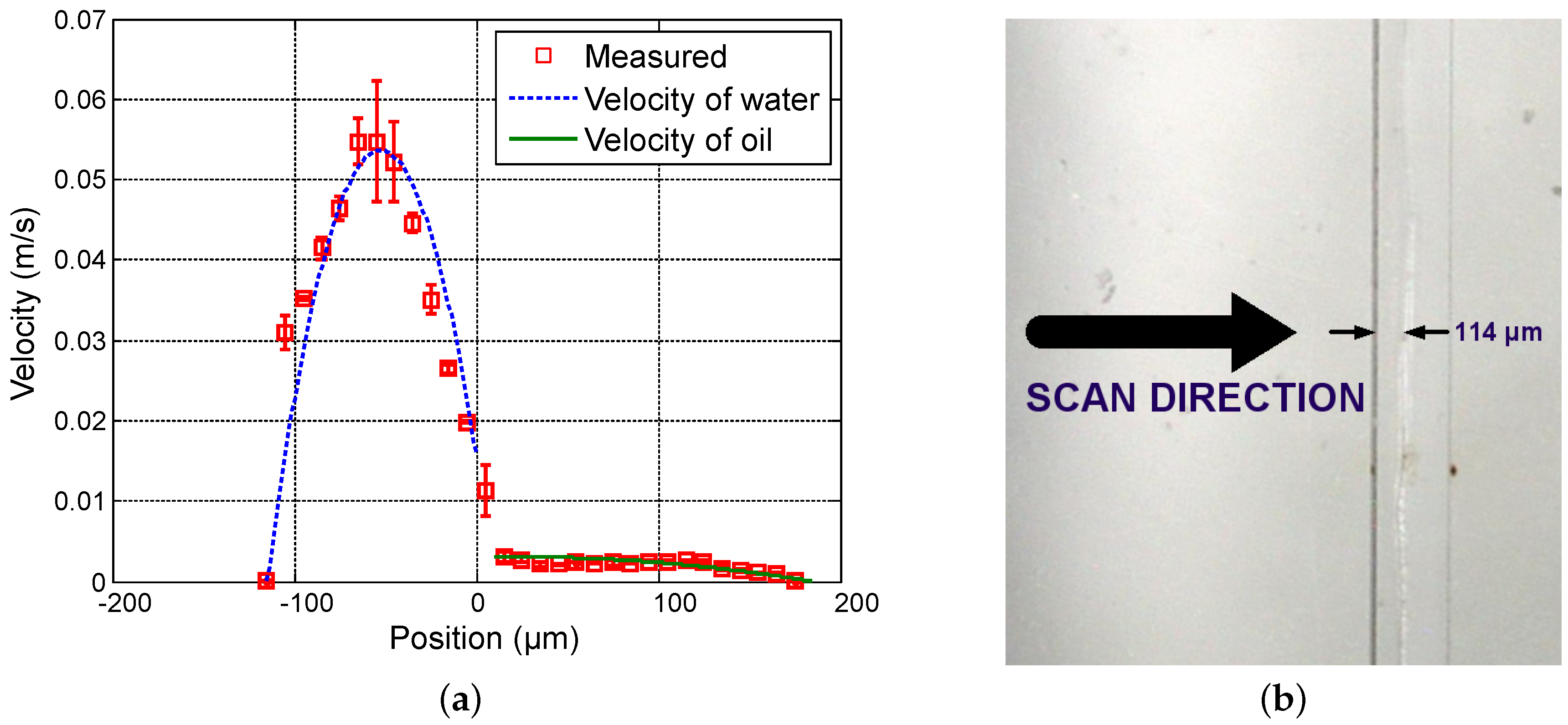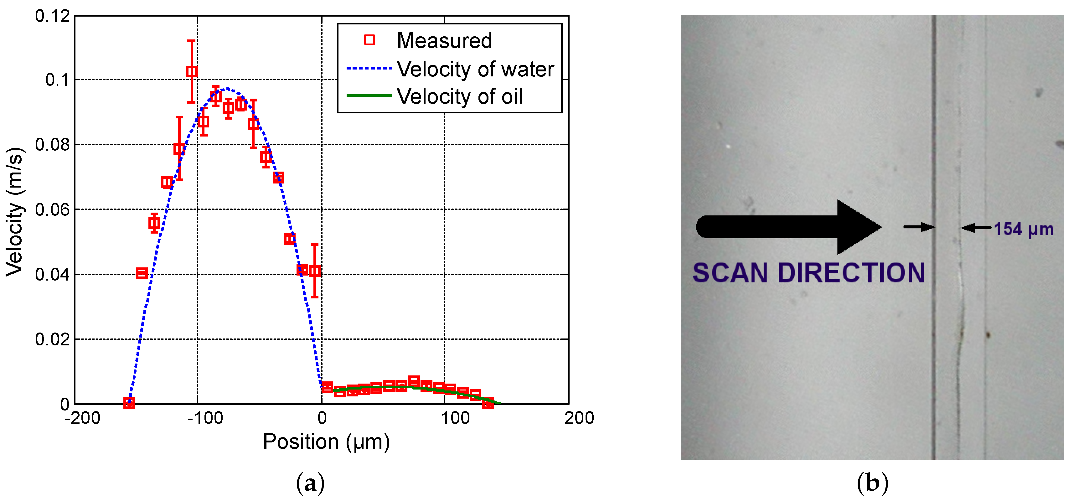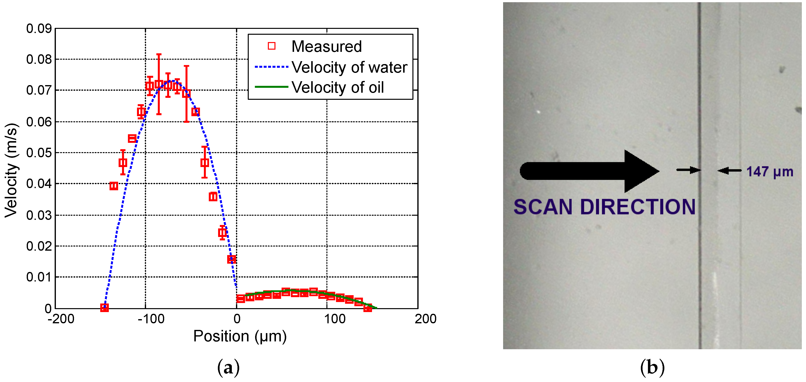 Experimental results for = 35 µL · min and = 3 µL · min. (a) Measured profile (squares) and theoretical profile for water (dashed line) and for oil (solid line); and (b) reference image of the main channel with indication of the interface location.
