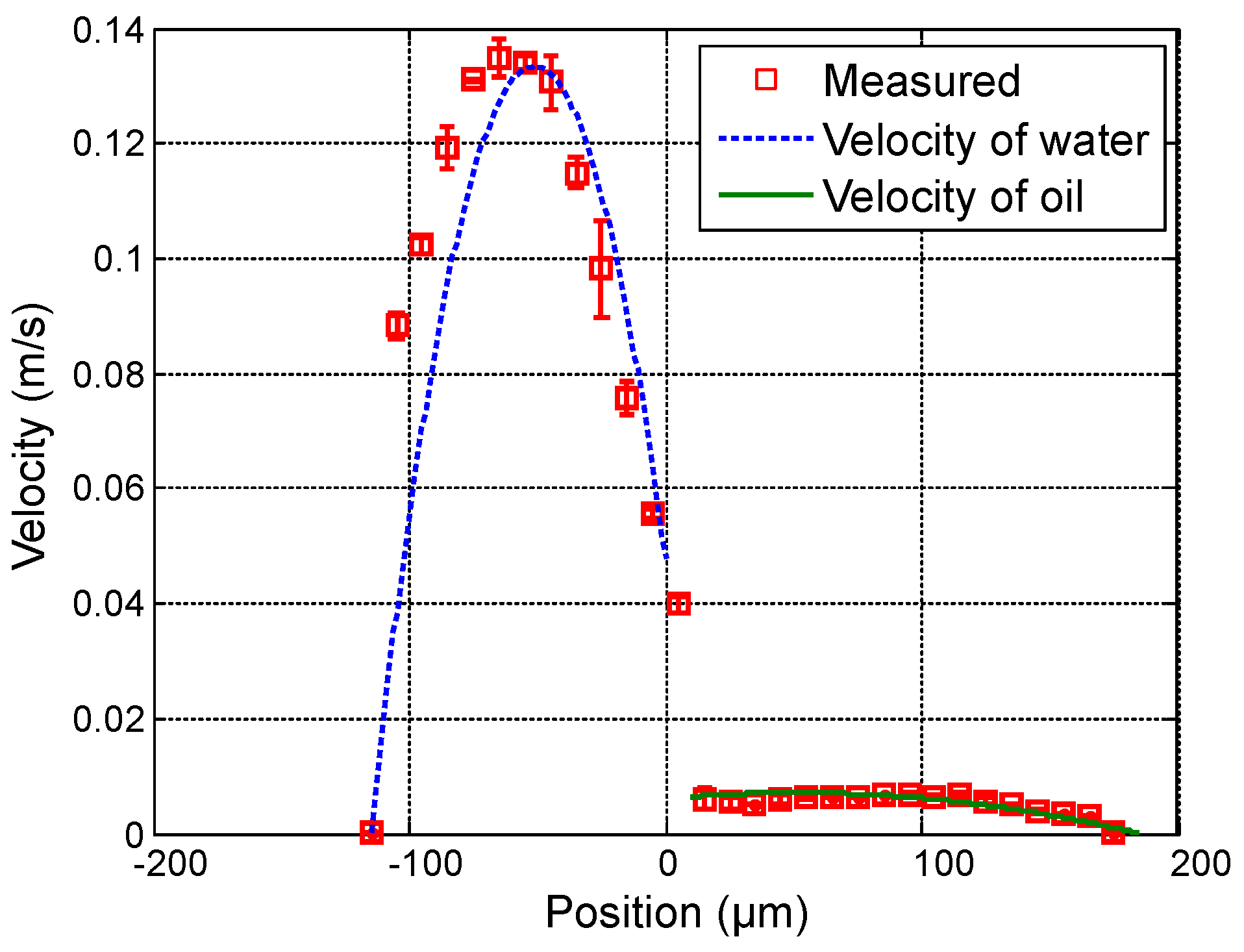 First, in order to vary the position of the interface between both fluids, the flow rate of water () varies from 20 µL · min to 50 µL · min in steps of 15 µL · min while the flow rate of oil () is fixed at 3 µL · min. Figure 4, Figure 5 and Figure 6 show the measured velocity profiles associated with the oil-water parallel flows in the microchannel. The square measurement points represent the averaging of the maximum velocity values measured over eight consecutive scans and the error bars represent the standard deviation of the maximum velocities at the same position. The locations of the interface, determined by image analysis, are reported for these profiles. The velocity profiles show that each fluid develops its own profile as stated by Pohar et al. [30]. In addition, at Figure 4, one can see that a slipping phenomenon exists at the interface. The velocity is not null due to the dragging effect of water on oil, while, for higher flow rate ratios (Figure 5 and Figure 6), the dragging effect is much less notable. In the case represented in Figure 4, the water flow affects the oil flow in a way that the oil reaches its maximum velocity in the vicinity of the interface. This behavior is typical of Couette flows, in which it is considered that each liquid flows in between two plates, one of which is moving—in this case, the fluids interface. For the configurations represented in Figure 5 and Figure 6, our measurements indicate a small slipping at the interface, as velocity values have a local minimum there.
