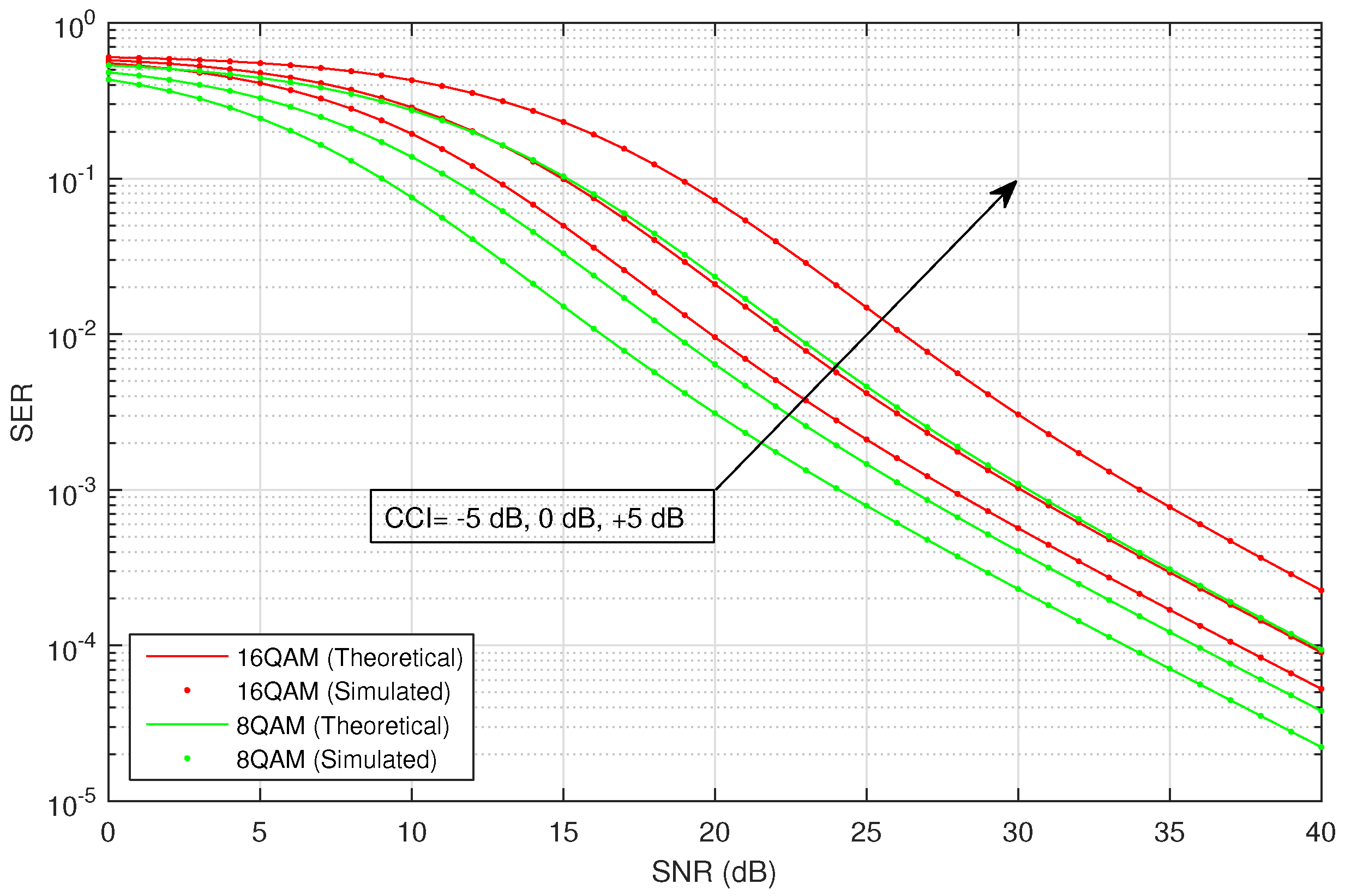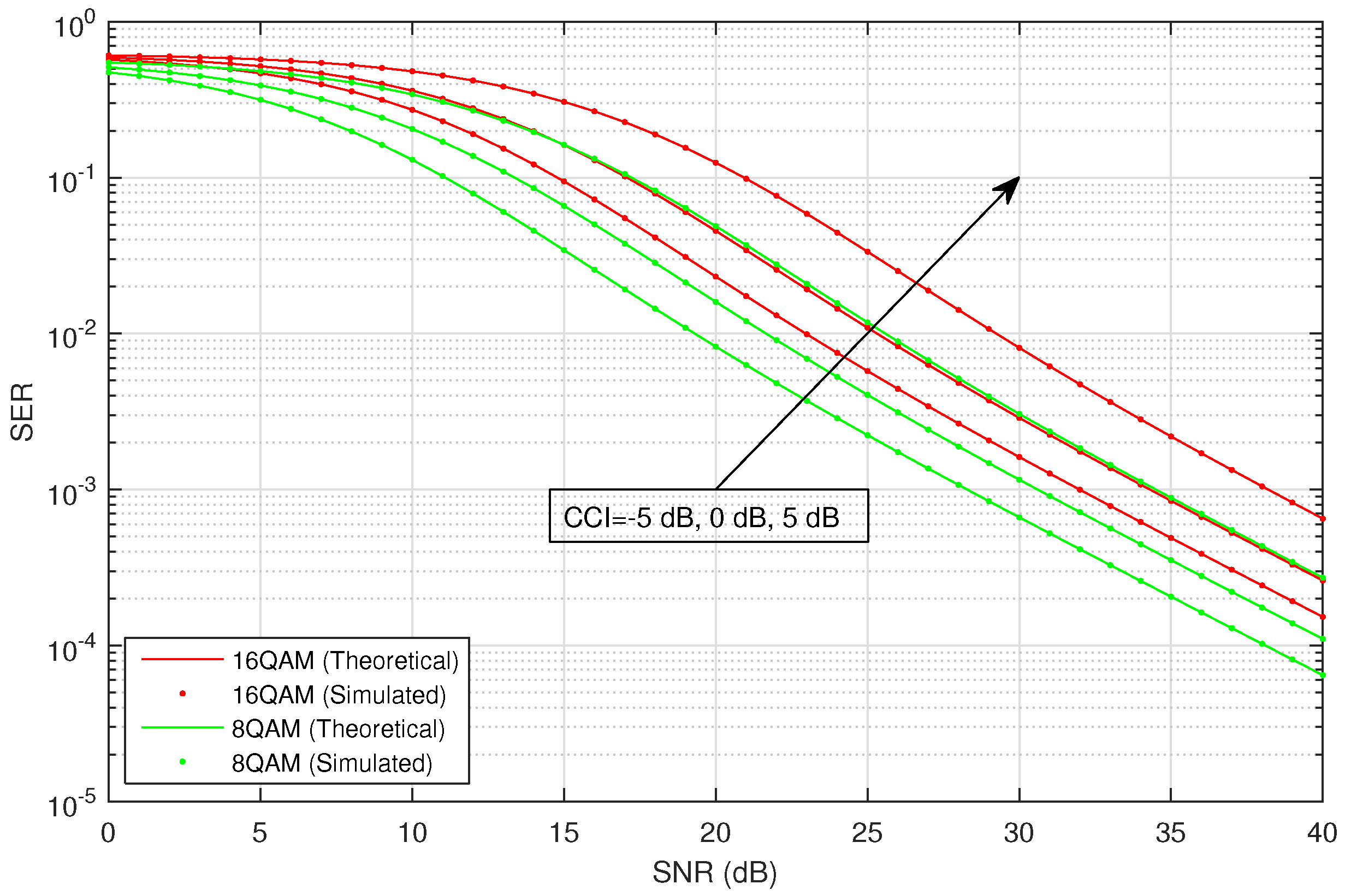 Average SER versus SNR for M-QAM with CCI in infrequent light shadowing.