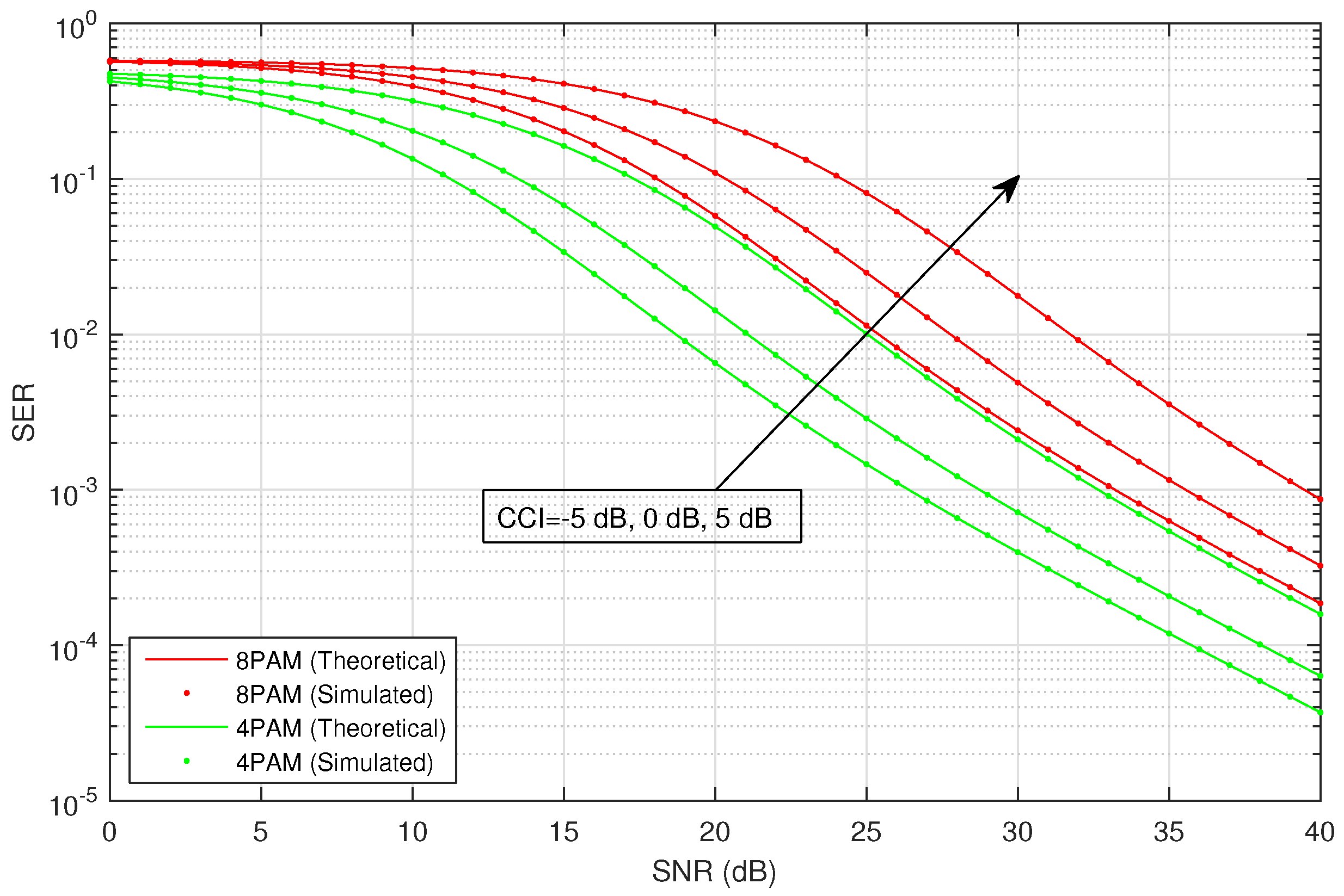 Average SER versus SNR for M-PAM with CCI in infrequent light shadowing.