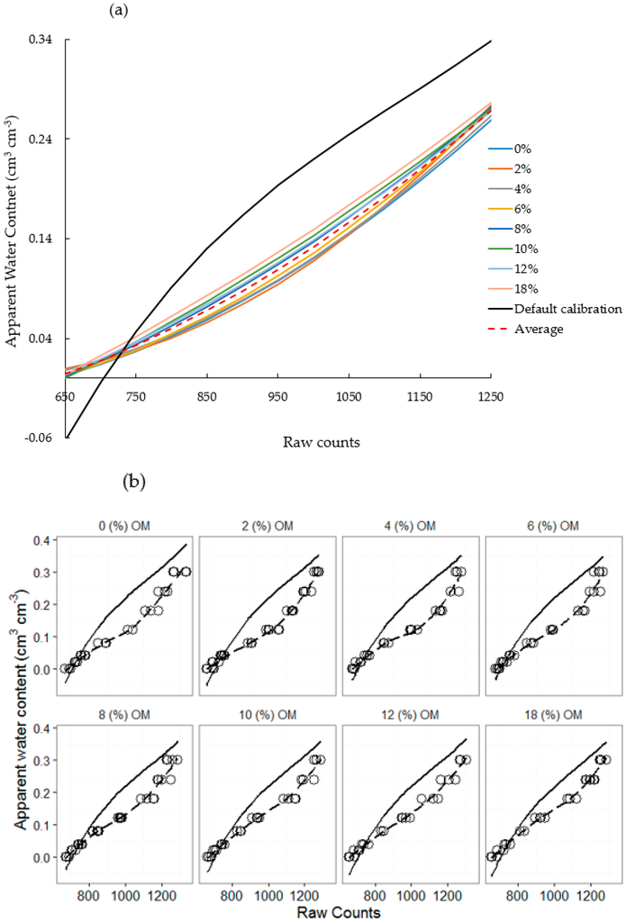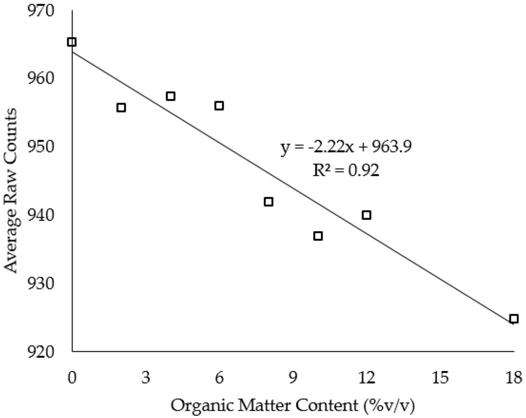 This underscores the need to account for the effect of organic matter on sensor readings. This can be achieved in two ways: (1) by developing organic-matter-level–specific calibration equations as presented in Table 2 and Figure 4; or (2) by developing a multivariate polynomial calibration equation that incorporates the organic matter level as a covariate with raw counts (Equation (3)).