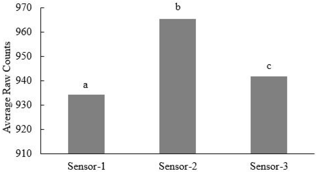 Sensor-to-sensor variation (Senor-1, Sensor-2, and Sensor-3) of sensor readings based on the results of the Tukey HSD test. Sensors not sharing the same letter are significantly different at p < 0.05.