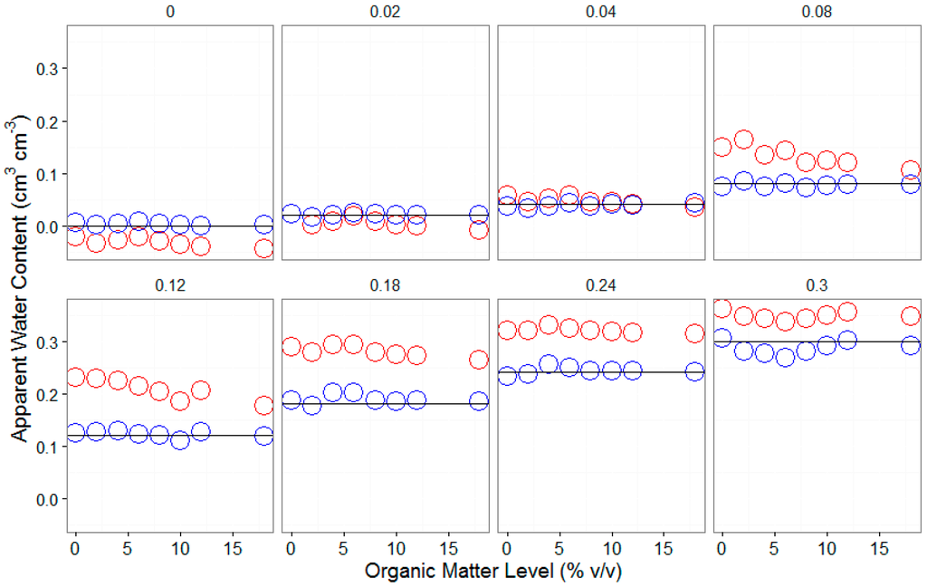 The new multivariate polynomial calibration equation, with raw counts and the organic matter level as covariates, fitted very well with the actual water content (see “blue” circles in Figure 5) as compared to the default calibration equation (e.g., see “red” circles in Figure 5). Similarly, the negative correlation between the sensor readings and organic matter level (Figure 1) was corrected using the new multivariate calibration equation (Figure 6).