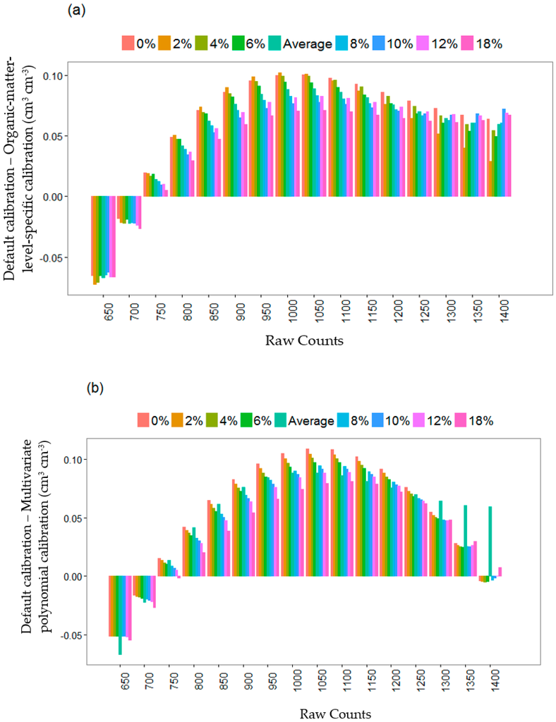 Moreover, the default calibration equation underestimated the apparent water content by up to 0.054 cm3 cm−3 at the drier portion of the soil water content range (<750 raw counts) (Figure 7a). In contrast, at the wetter portion of the soil water content range (≥750 raw counts) its predictions were greater than those of the new calibration equations by up to 0.01 cm3 cm−3. Uncertainties of the default calibration as compared to those of the organic-matter-level–specific and multivariate polynomial calibration equations mostly show similar trends. However, at greater sensor readings (>1100 raw counts), the differences between the default calibration and the organic-matter-level-specific calibration equations were more or less the same, while there was a relatively greater decrease in the differences between the default and the multivariate polynomial calibration equations (Figure 7b).