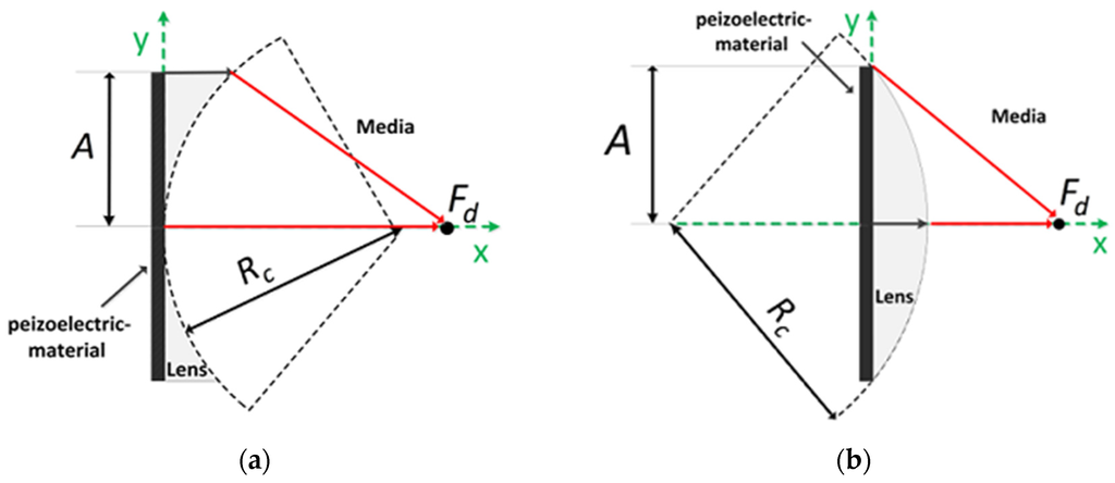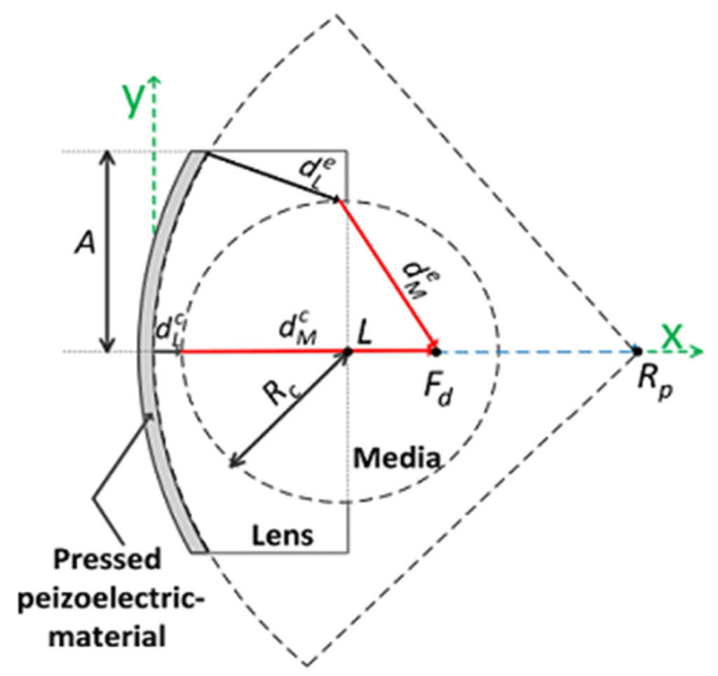 Ultrasound can be geometrically focused using two different methods: physical conformation and an acoustic lens [12,13,14,15,16]. For physical conformation, the aperture is spherically shaped so that ultrasound signals from the edge and the center of a piezoelectric material can simultaneously arrive at the center of curvature. In the case of an acoustic lens, also, ultrasound signals from the edge and the center of a piezoelectric material should arrive at a focal point at the same time after traveling through different lens thicknesses. Based on this assumption, we will derive equations to obtain design parameters for a lens.