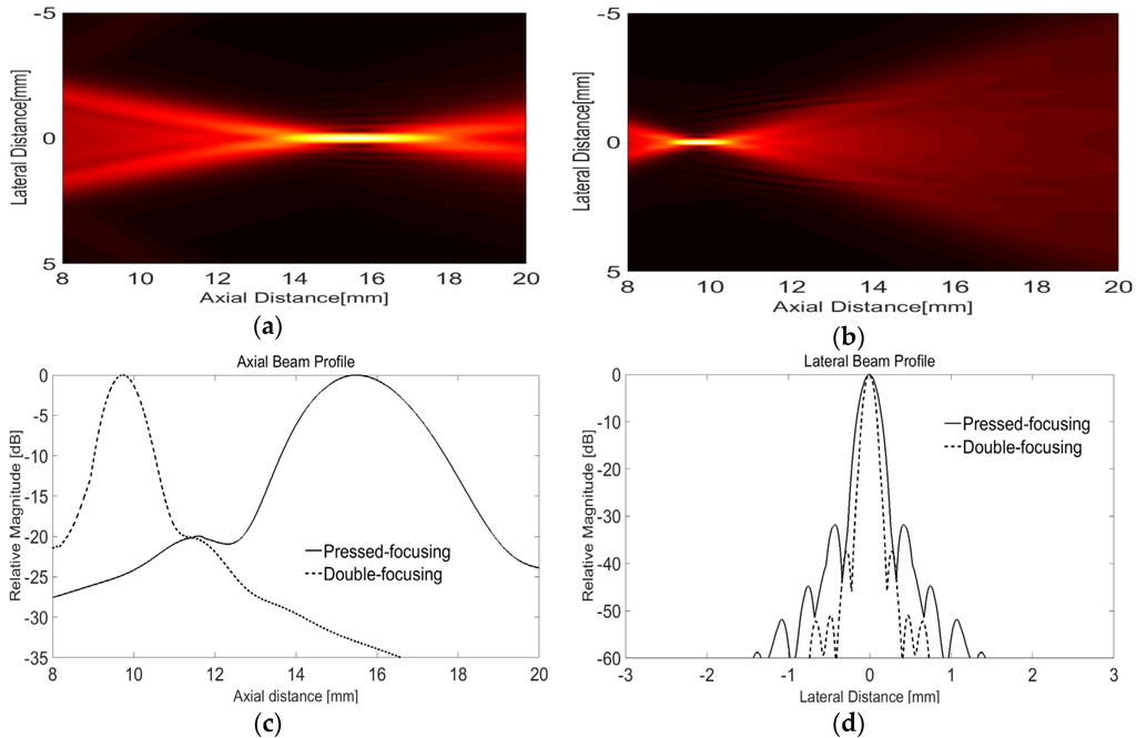 Beam propagation simulated using PZFlex: one-way radiation patterns produced by the concave transducer for initial focusing (a) and the double-focused transducer designed in this study (b). (c,d) show the lateral and axial beam profiles at the maximum intensity of the radiation patterns.