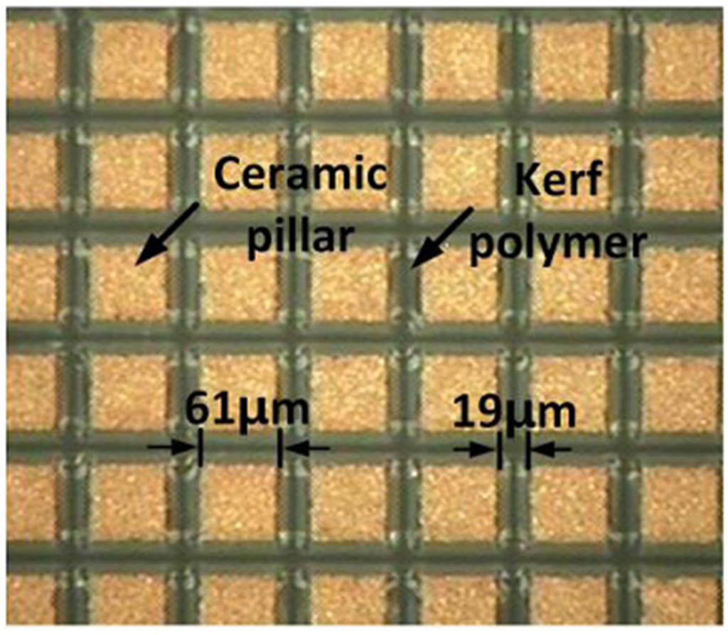 For the 1-3 peizo-composite in this study, PZT-5H (CTS3203HD, CTS Technology, Sparta, Greece) and a mixture of Epo-tek 301 (Epoxy technologies, Billerica, MA, USA) and LP-3 (Thiokol Corp., Chiba, Japan) as a kerf filler were used. The widths of kerf polymer, dp, and ceramic pillar, dc, were decided in order to avoid the first lateral mode [22], i.e.: