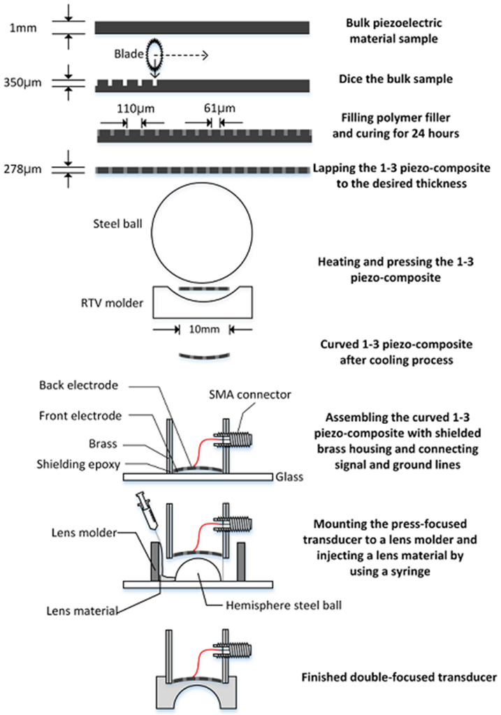 Illustration of the step-by-step fabrication process for a double-focused transducer.