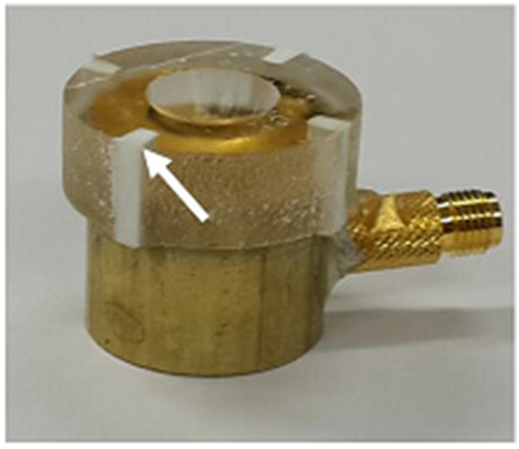 Photograph of the finished double-focused transducer. The white arrow indicates the part of an acoustic lens molder remaining after lapping. The lens molder was used to secure the maximum thickness of the lens, i.e., 6.5 mm.
