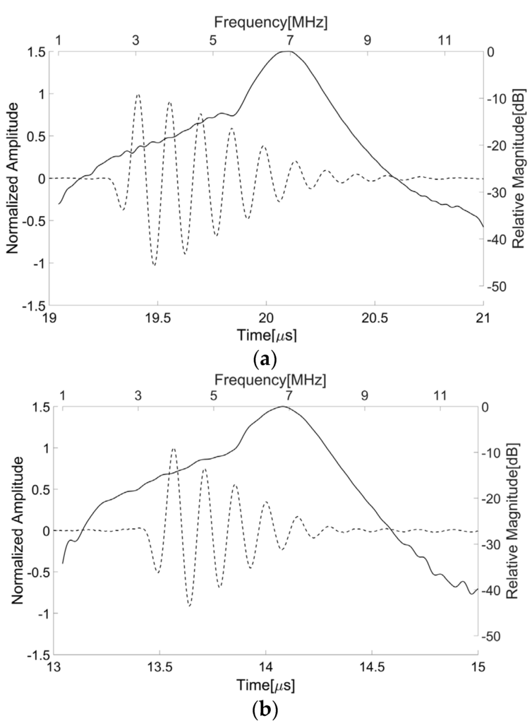 Pulse-echo waveforms and their spectra measured from the press-focused transducer before the lens casting process (a) and the double-focused transducer fabricated in this study (b). The solid line indicates the magnitude of the spectrum and the dotted line is the pulse-echo waveform.