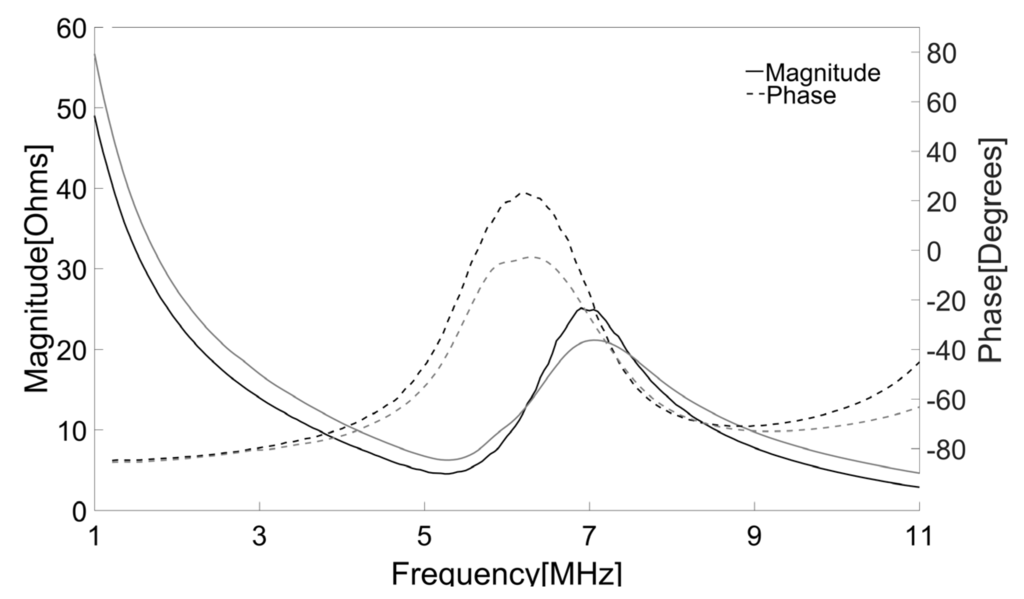 The electrical impedance of both press-focused and double-focused transducers was measured using an impedance analyzer (HP4294A, Agilent, Santa Clara, CA, USA). Since an acoustic load affects electrical impedance and a press-focused transducer should be used in water, both transducers were immersed into the water bath for the measurement. Note that the electrical impedance of the double-focused transducer was the same regardless of the acoustic load, i.e., either water or air, because it had the lens as an acoustic load. The measurement was conducted in a frequency range from 1 MHz to 11 MHz at an increment of 0.05 MHz. As shown in Figure 9, the press-focused transducer had an impedance magnitude of 25 Ω and a phase angle of −20.6° at its peak frequency. On the other hand, those were, respectively, 20.5 Ω and −23.6° at the peak frequency in the case of the double-focused transducer.