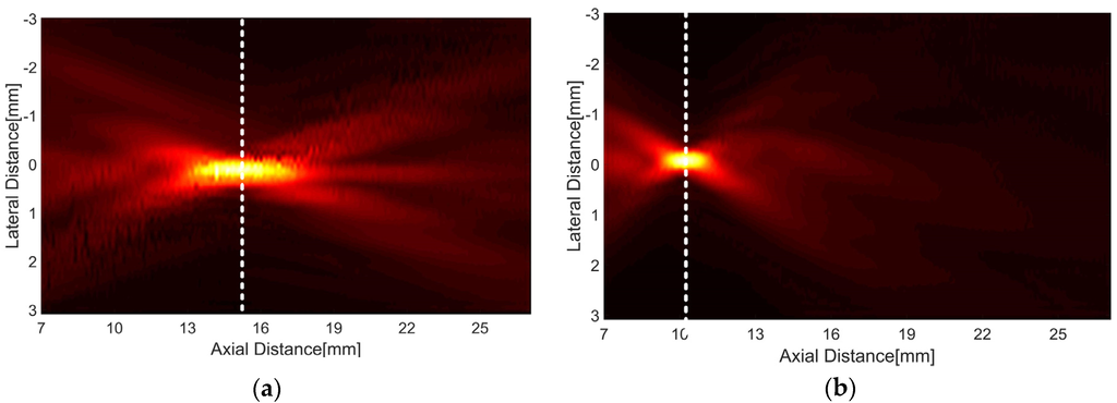 To investigate the focal length, the transmit ultrasound was measured using AIMS (Acoustic Intensity Measurement System, ONDA Corporation, Sunnyvale, CA, USA) equipped with a needle hydrophone (HGL-0200). The transducer was aligned by controlling a motorized two-rotational axis against the hydrophone, horizontally. For signal generation, a function generator (AFG3232C, Tektronix Inc., Beaverton, OR, USA) in burst mode (i.e., sine wave with 1 cycle and 5 Vp-p) was used. A focal length was determined when the amplitude of the ultrasound received by the hydrophone became the maximum value. As shown in Figure 10, the measured one-way radiation patterns demonstrated that the focal length of the double-focused transducer was shorter than that of the press-focused transducer. The double-focused transducer had the peak pressure at 10.2 mm and the press-focused transducer did at 15.2 mm. This means that the focal depth of the double-focused transducer is 3.5 mm when the transducer is in contact with the skin surface because the maximum thickness of a standoff made out of the lens material is 6.5 mm. Note that the proposed transducer does not require any additional acoustic media such as water. In addition, the double-focused transducer provided the −3 dB lateral beam width and DOF of 250 μm and 1.33 mm, respectively, whereas those were 325 μm and 3.2 mm in the case of the press-focused transducer. These results agree well with the theoretical values obtained from Field II simulation; the −3 dB lateral beam width and DOF were 224 μm and 1.4 mm when a concave transducer with an aperture of 10 mm in diameter and a focal length of 10 mm was simulated. Also, those were 336 μm and 3.2 mm in the case of a 15 mm focal length. Under the assumption where a focal volume is a rectangular parallelepiped and elevation beam width is equal to lateral beam width for a simple calculation, the −3, −6, −10, and −12 dB focal volumes were obtained to be 0.08, 0.26, 0.50, and 0.67 mm3, respectively; those of the press-focused transducer were 0.34, 1.03, 3.00, and 4.40 mm3. This implies that the double-focused transducer has the beneficial ability to induce coagulative necrosis in a small volume (e.g., 1 mm3) because cavitation occurring during HIFU treatment possibly results in lesion enlargement [13,23,24]. In Figure 10, the white dashed lines indicate the depth at which the maximum pressure occurred: 15.2 mm in the case of the press-focused transducer and 10.2 mm in the double-focused one. These experimental results suitably demonstrated that the proposed double-focusing technique is capable of building a focal point at the desired location without reducing aperture and, thus, achieving tighter focusing of ultrasound energy.