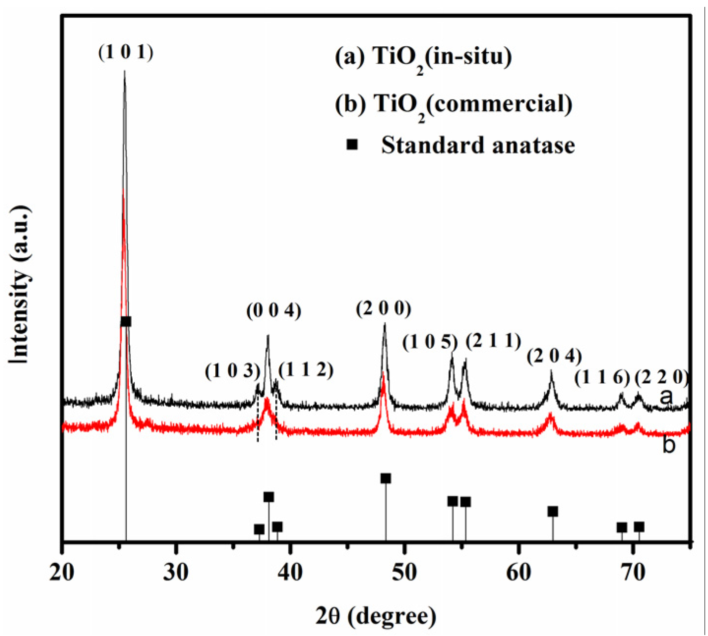 The XRD spectra of (a) TiO2 (in-situ) sample; and (b) TiO2 (commercial) samples.