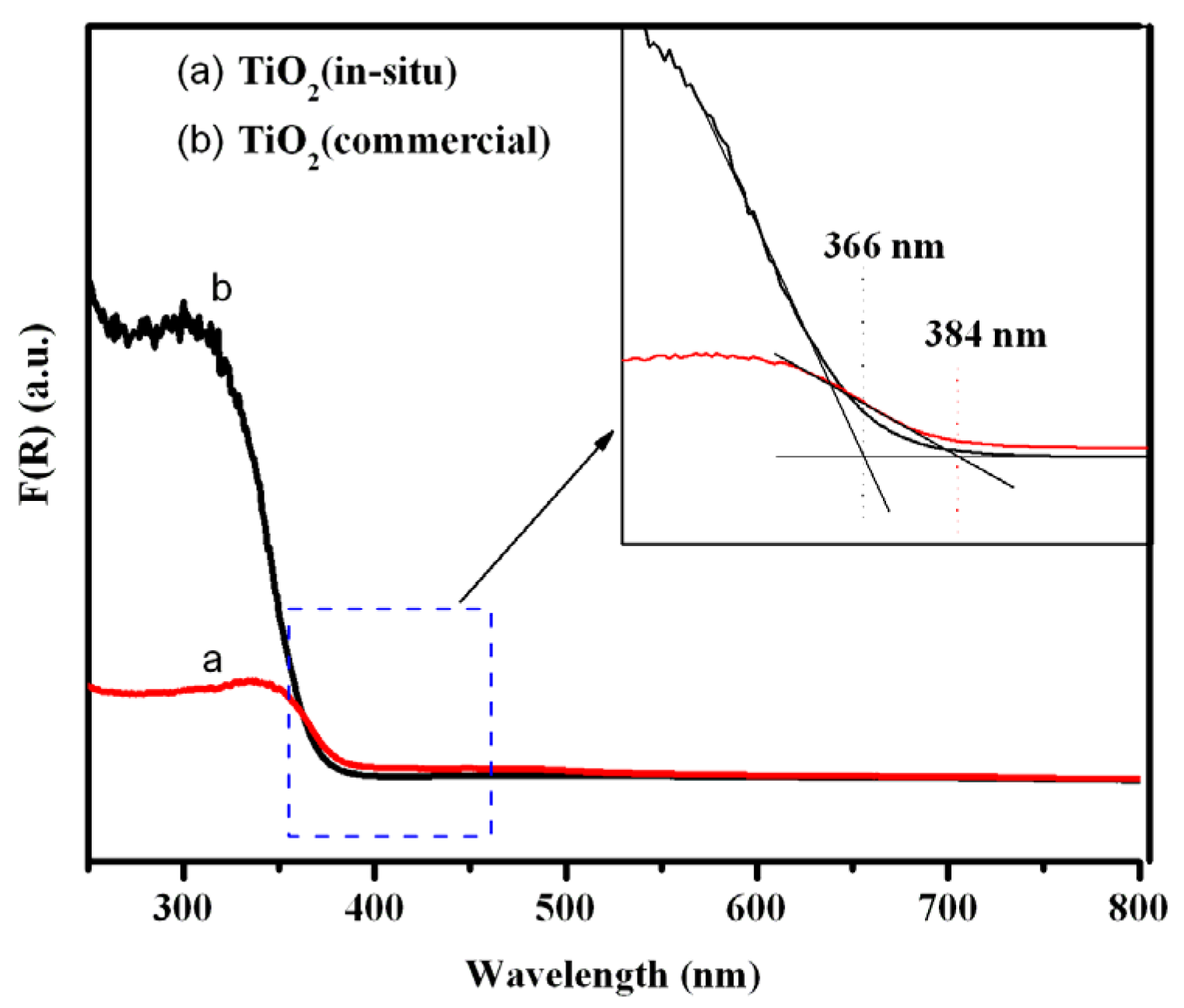 UV-vis diffuse reflectance spectra (DRS) of: (a) TiO2 (in-situ) sample; and (b) TiO2 (commercial) samples.