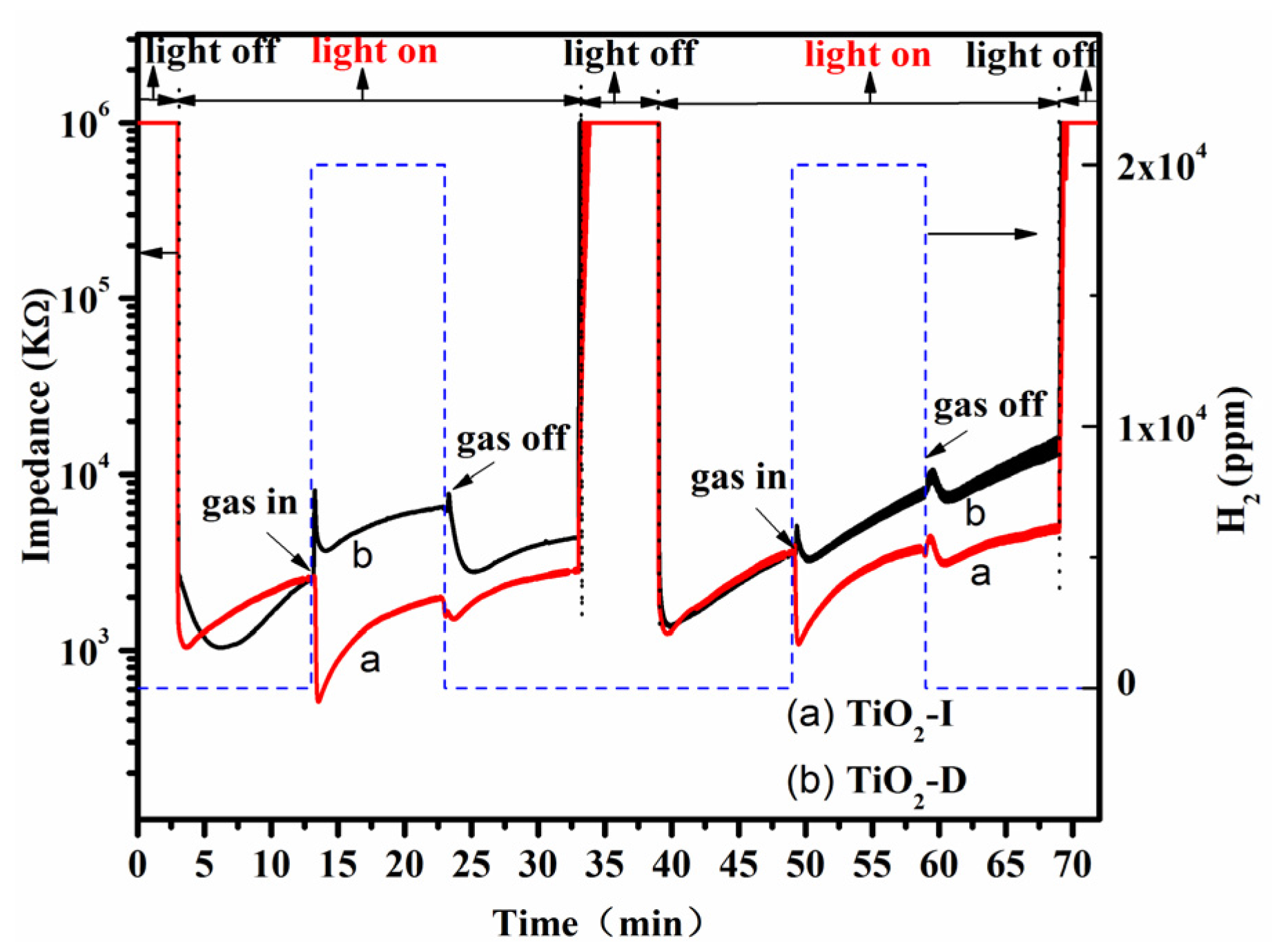 Gas sensing processes to H2 under UV light irradiation at room temperature in N2 atmosphere over two different samples: (a) the in-situ prepared TiO2 sensor sample (TiO2-I); and (b) the drop-coating prepared TiO2 sensor sample (TiO2-D). The solid curves denote the impedance module of samples as function of time, and the dotted line denotes the concentration of H2 during the testing process.