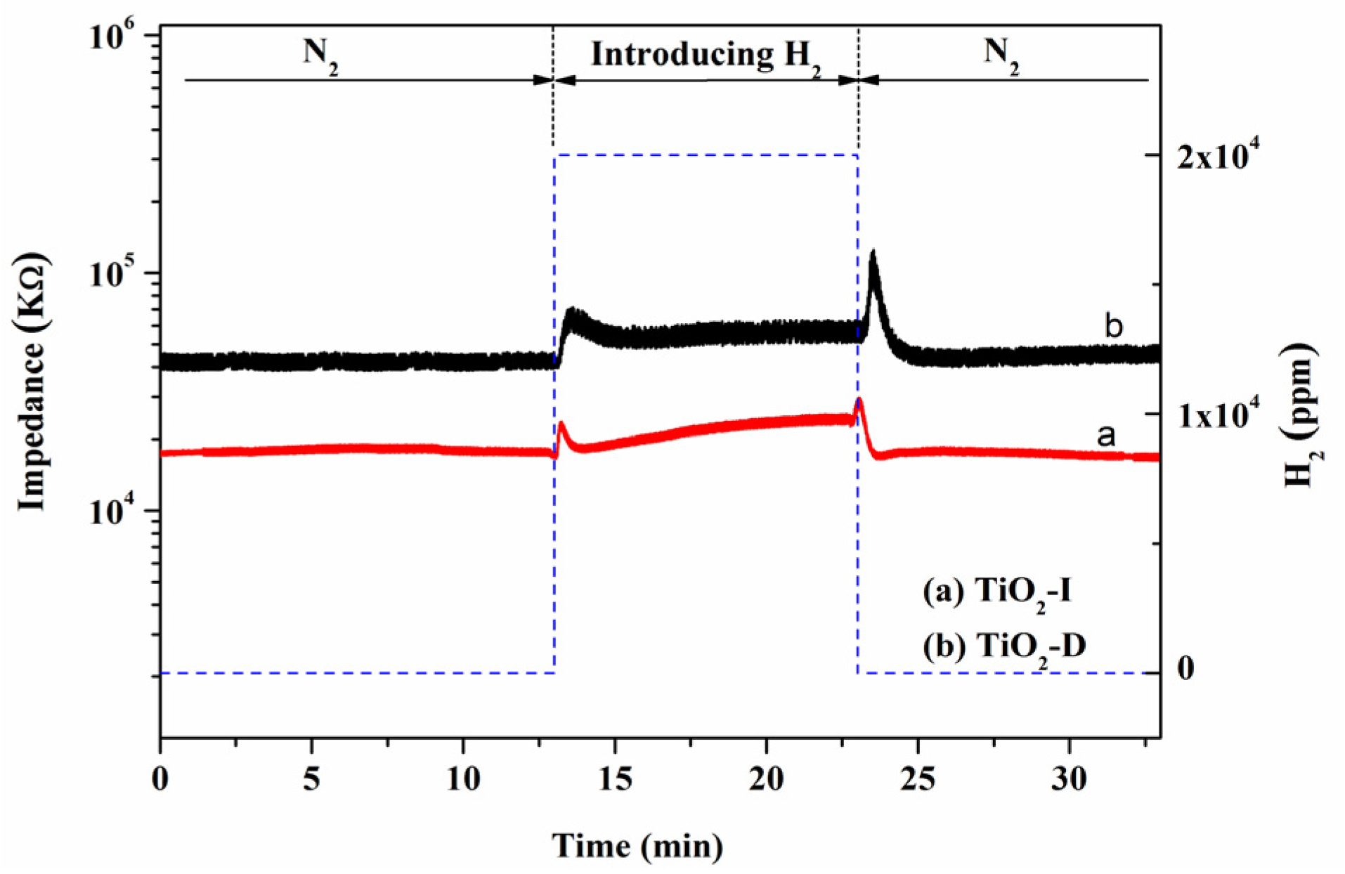 Gas sensing process to H2 in N2 atmosphere at 400 °C without UV light over: (a) TiO2-I samples; and (b) TiO2-D samples. The solid curves denote the impedance module of samples as function of time, and the dotted line denotes the concentration of H2 during the testing process.