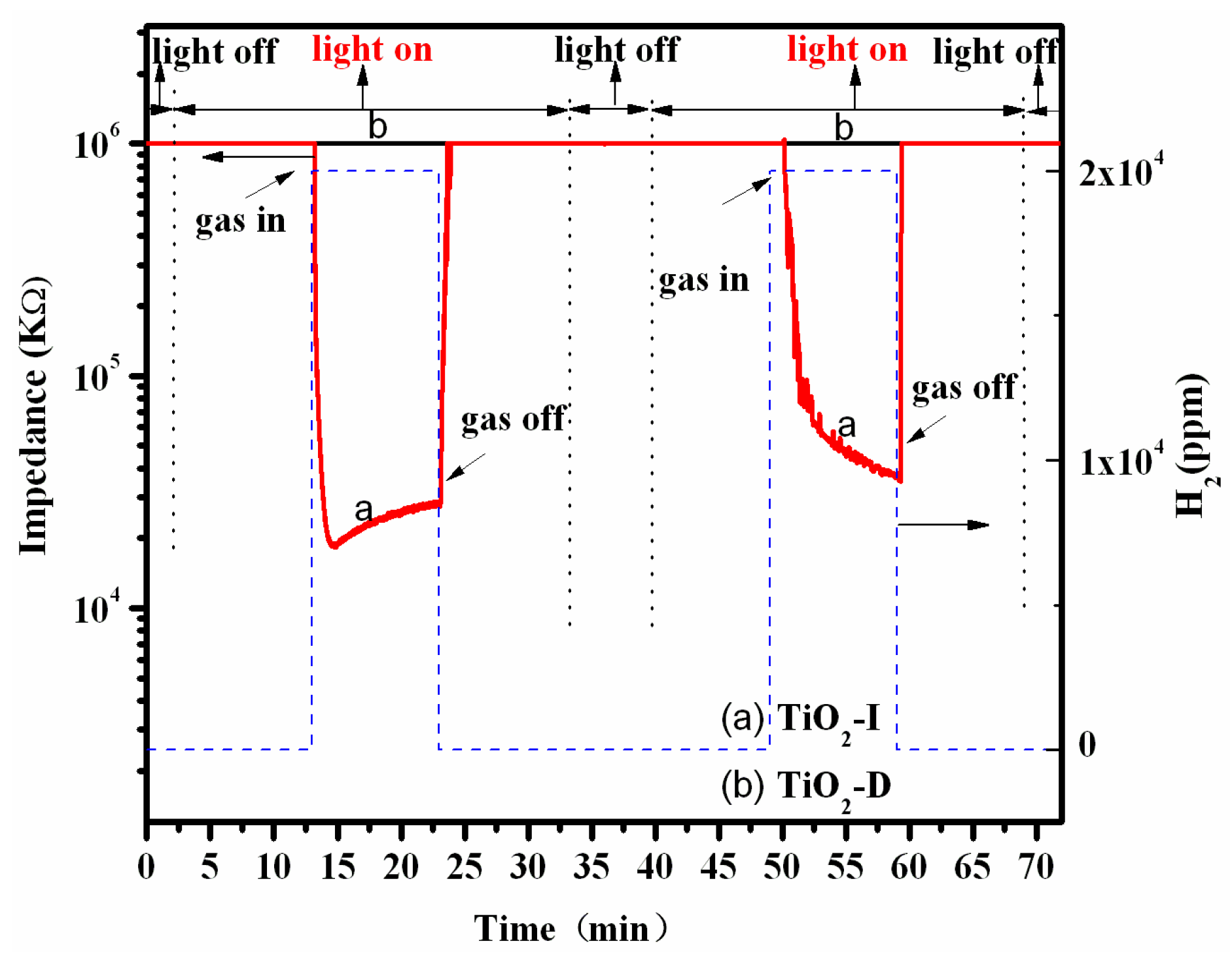Photo-assisted gas sensing response to H2 in N2 atmosphere under the UV irradiation over (a) the in-situ prepared TiO2 sensor sample (TiO2-I) and (b) the drop-coating prepared TiO2 sensor sample (TiO2-D) in Figure 4. Since the impedance values under UV irradiation seemed not to be stable, the R0 was assigned to the last impedance value prior to introducing H2, while the Rgas was assigned to the lowest value after introducing H2.