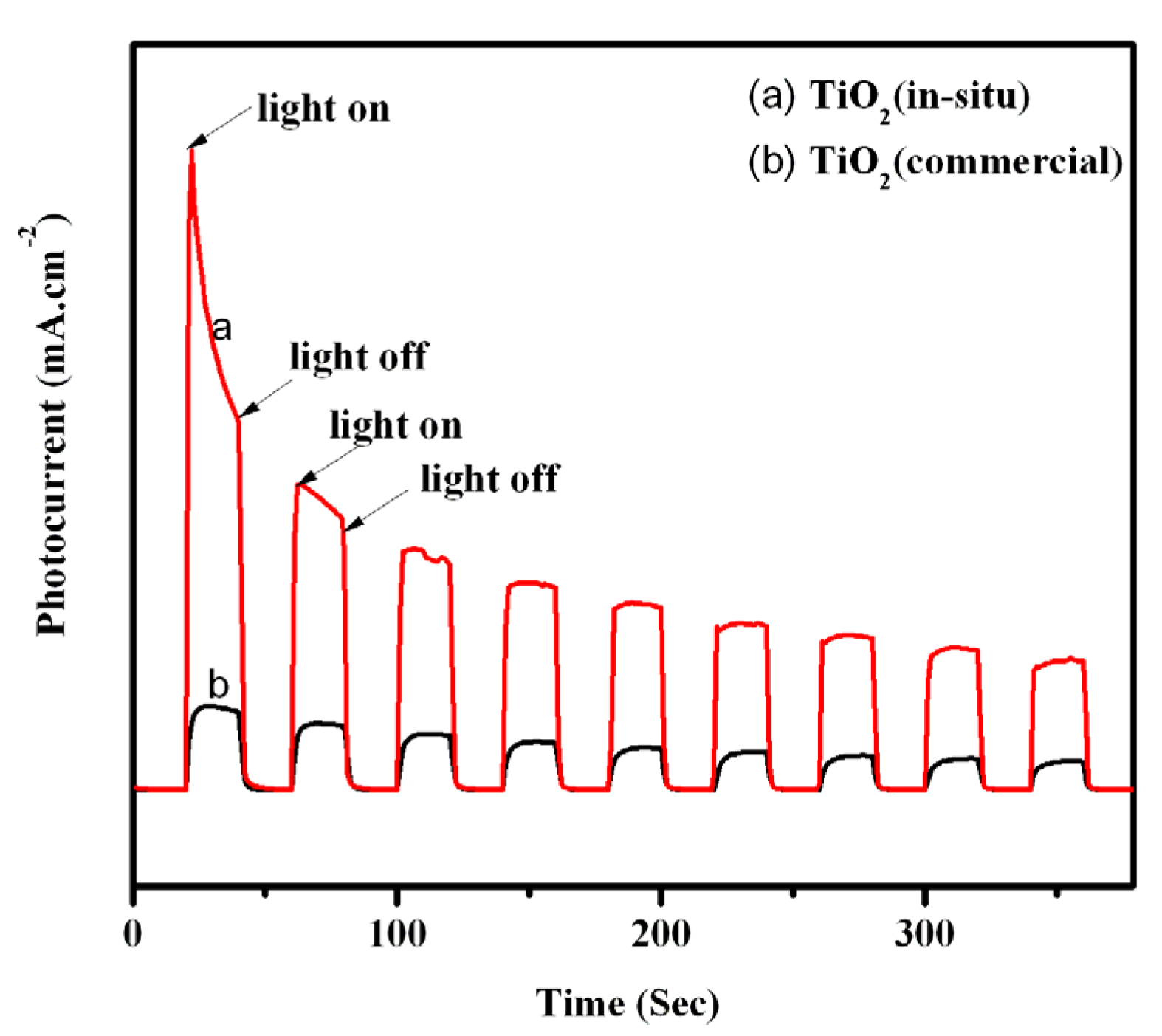 Transient photocurrent responses of: (a) TiO2 (in-situ) samples; and (b) TiO2 (commercial) samples in 0.02 M Na2SO4 aqueous solution under UV light irradiation.