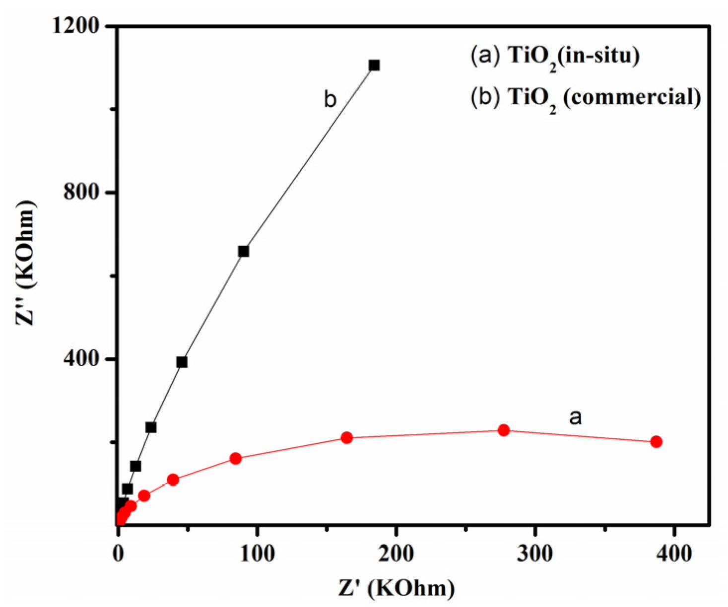 EIS Nyquist plots of: (a) TiO2 (in-situ) samples; and (b) TiO2 (commercial) samples. The amplitude of the sinusoidal wave was set at 10mV and the frequency varied from 100 kHz to 0.05 Hz. The Z' and Z'' correspond to the real part and the imaginary part of the impedance, as the horizontal and vertical axis in the impedance spectra, respectively.