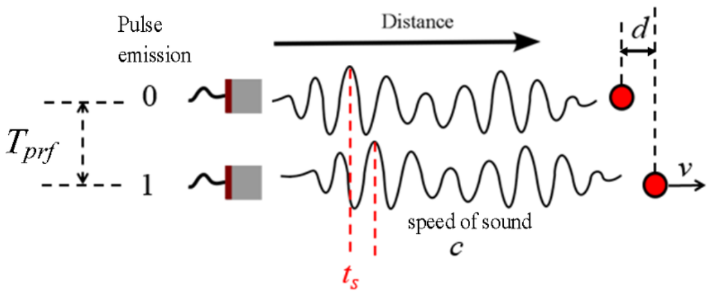 From this figure, a moving reflector travels a distance d at a velocity v during the interval Tprf between emissions, which results on the relation v = d/Tprf. Due to reflector movement, the echoes will show a displacement represented by the time shift ts measured as the relation among the distance d and the sound speed c, given by ts = 2d/c. Combining both relations, the velocity is a function of the ultrasonic echoes displacements and it can be computed as: