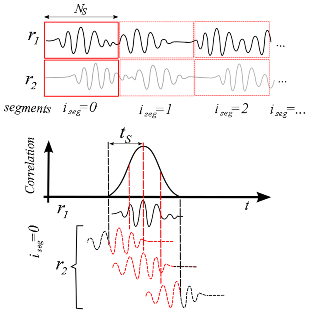 The cross-correlation technique has been extensively used as a tool to investigate numerous digital signal processing applications involving time-delay estimation [23]. The technique was firstly proposed for ultrasonic velocity estimation by Bonnefous and Pesqué [24]. The measurement principle is illustrated in Figure 3.