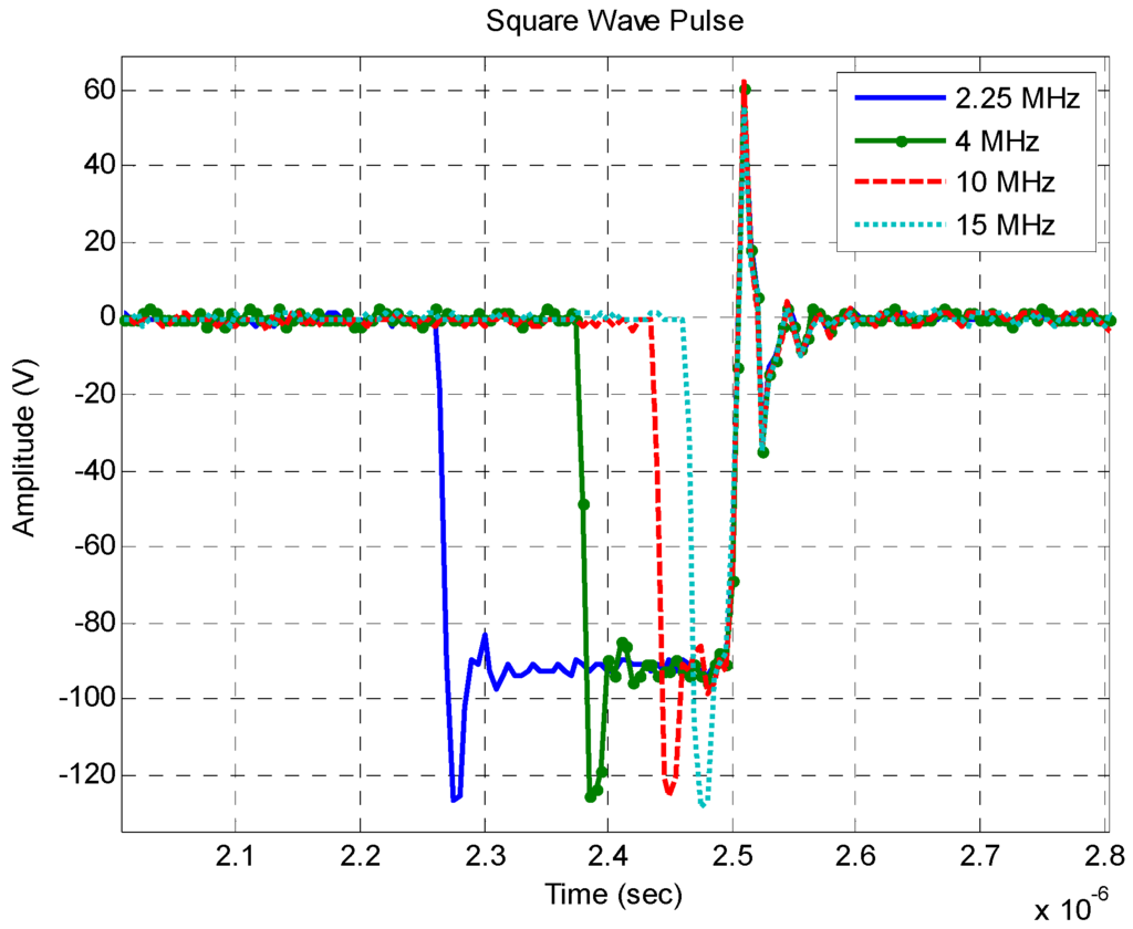 Square wave pulses tuned to half-frequency of transducers with 2.25, 4, 10 and 15 MHz center frequency.